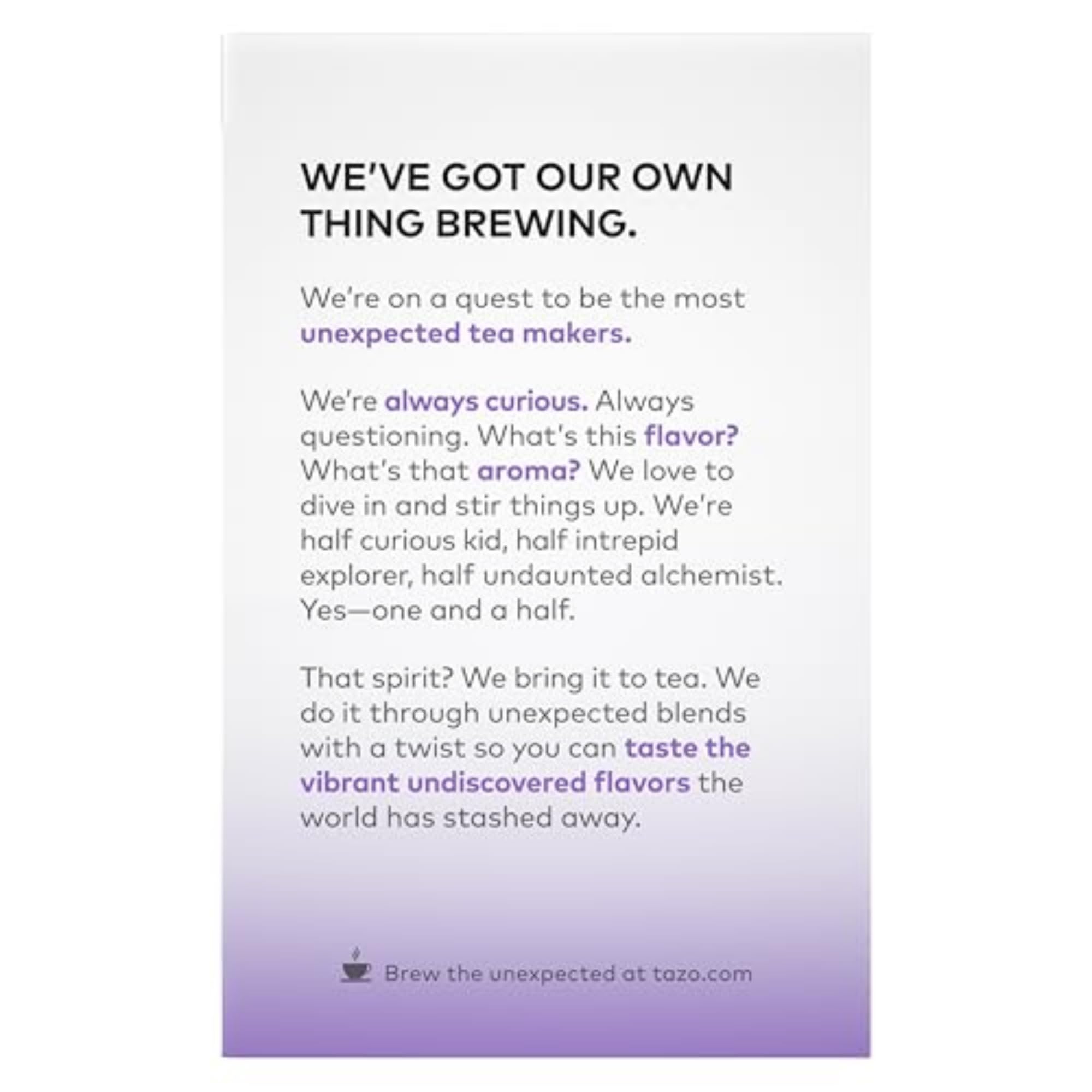 TRUSTED COMPANY: TAZO Teas are produced without genetic engineering, meeting the Non-GMO Project Standard. Ingredients are expertly sourced giving a taste for you to savor