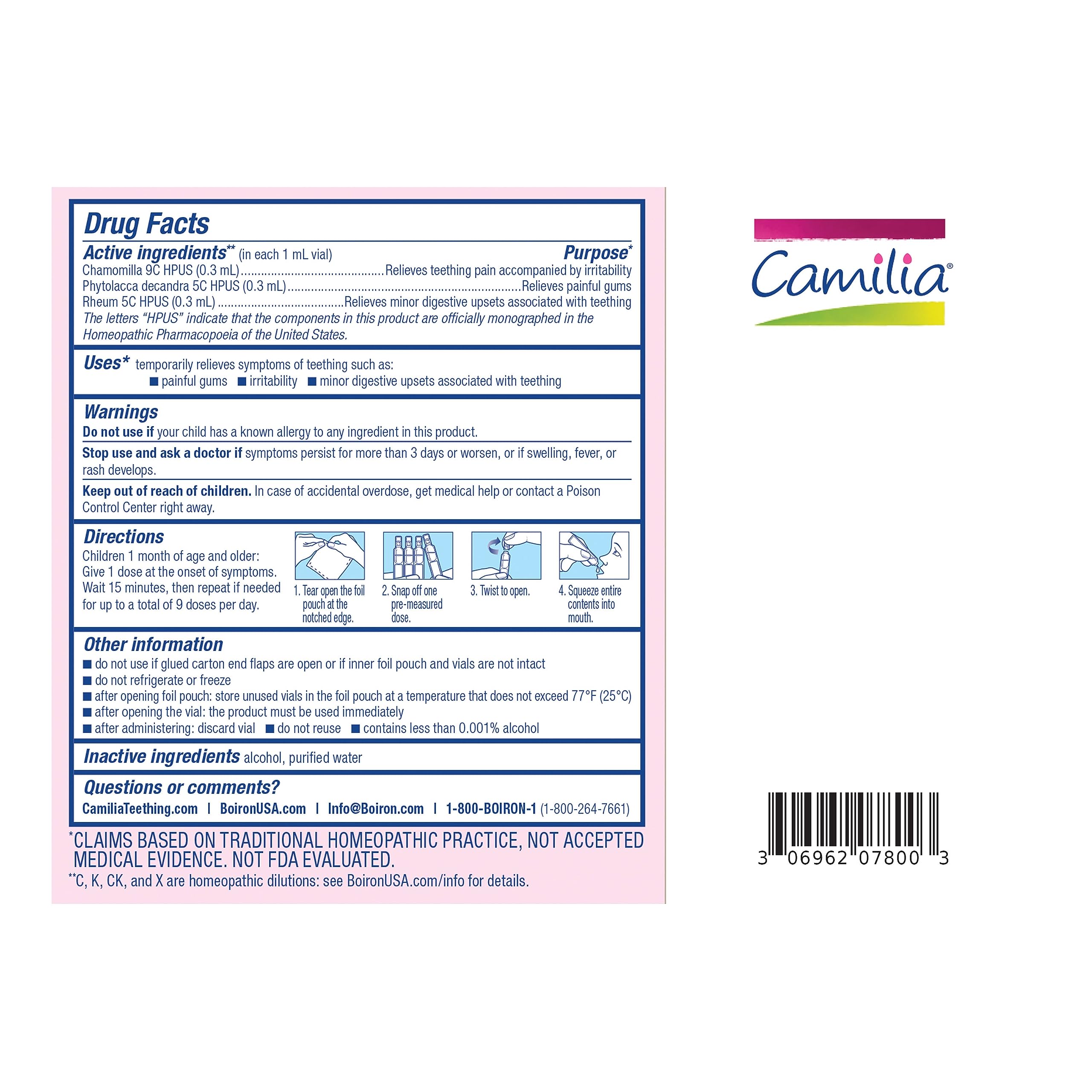 Camilia's natural active ingredients include Chamomilla 9C HPUS (relieves teething pain accompanied by irritability), Phytolacca decondra 5C HPUS (relieves painful gums) and Rheum 5C HPUS (relieves minor digestive disorders associated with teething).