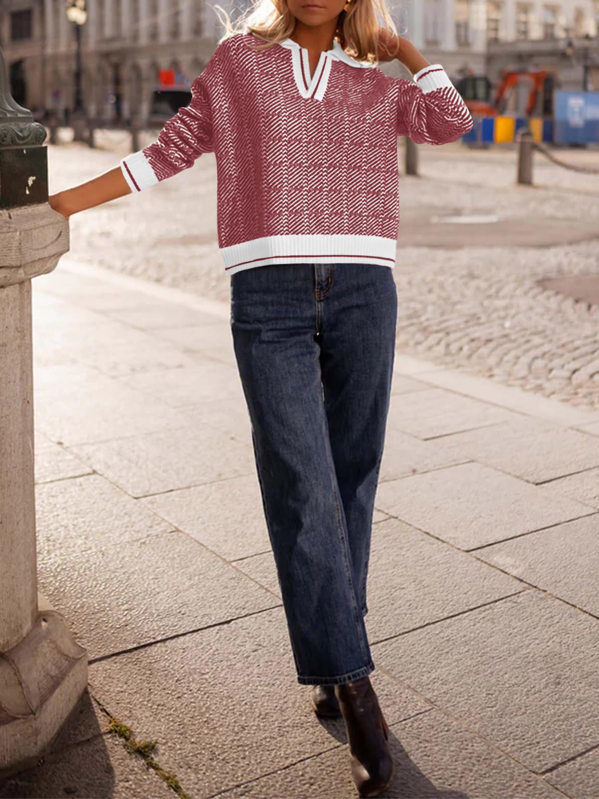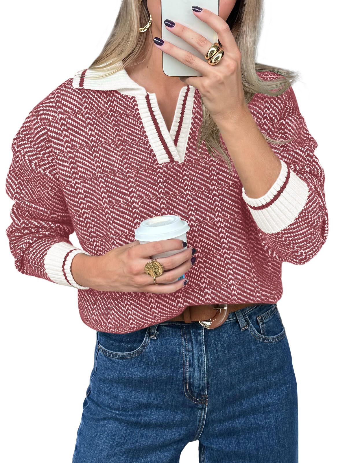 Features - V neck collared sweaters for women, long sleeve cozy sweaters with chic fold-over lapel collar, color block at neckline/cuffs/hem, slightly loose fit with a straight cut structure, soft thick warm trendy sweaters for fall and winter