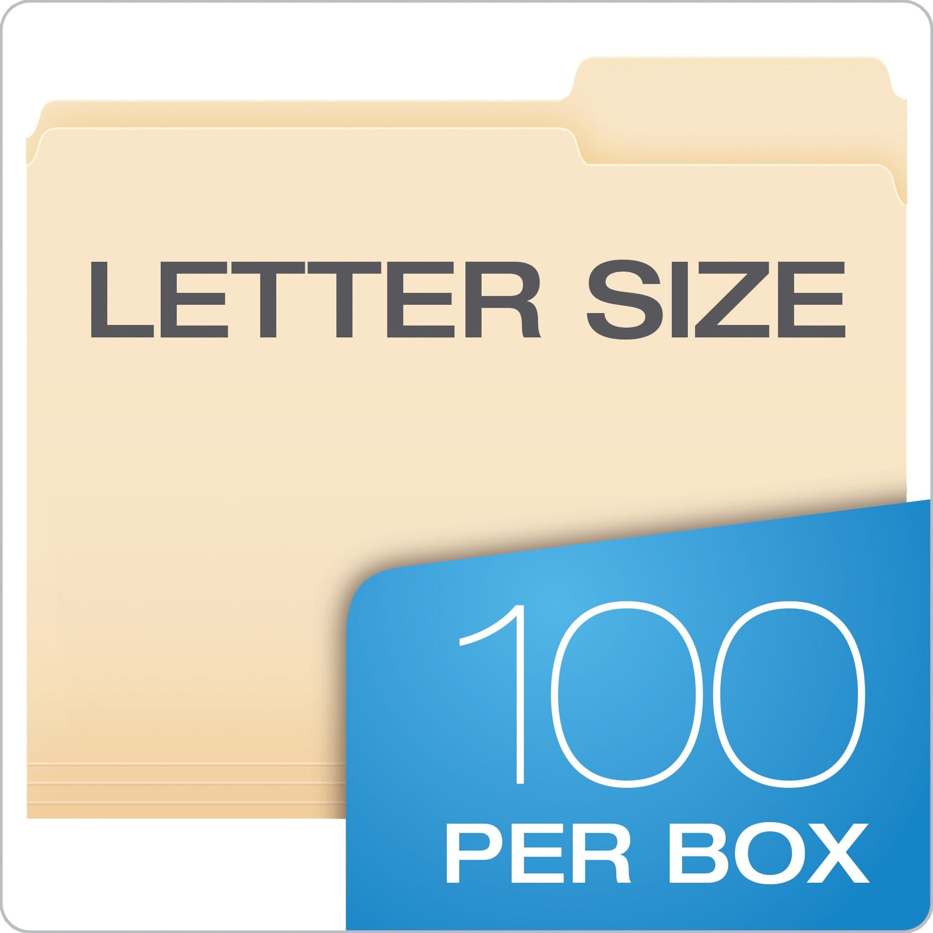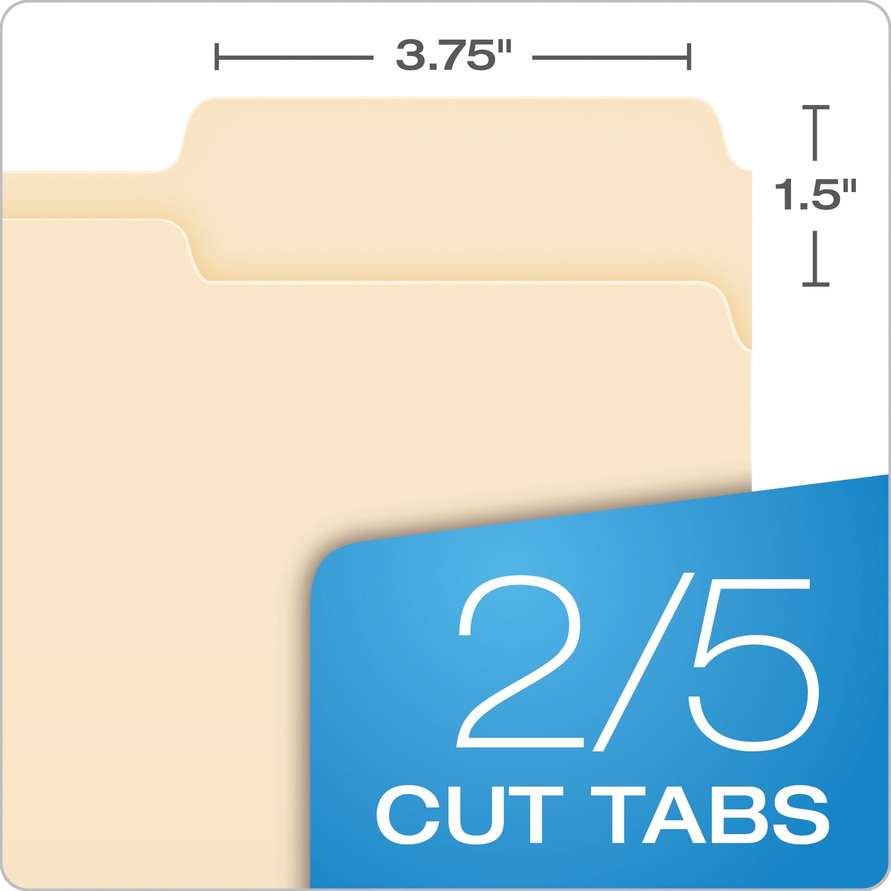 Pendaflex Essentials File Folders are perfect for your everyday filing needs. Durable 11 pt. manila covers can stand up to active projects. These letter-sized folders fit nicely in your standard hanging file folders. 2/5 Cut Tabs. Paper made from 10% recycled fiber with 10% post-consumer fiber. 100 per box.