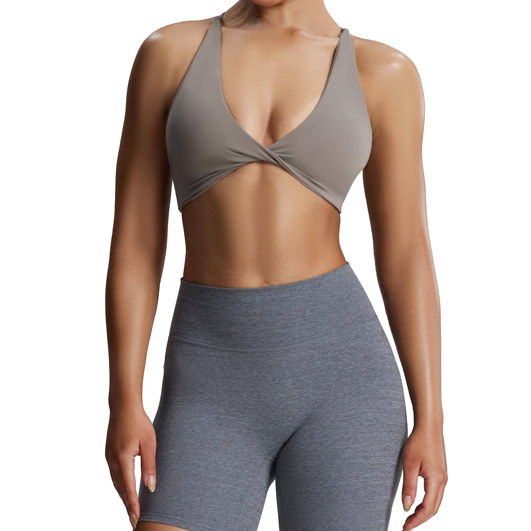 The Sienna twist womens sports bra featuring thin crossed back straps and padding, despite small straps, it doesn’t bite into your traps and cause neck pain