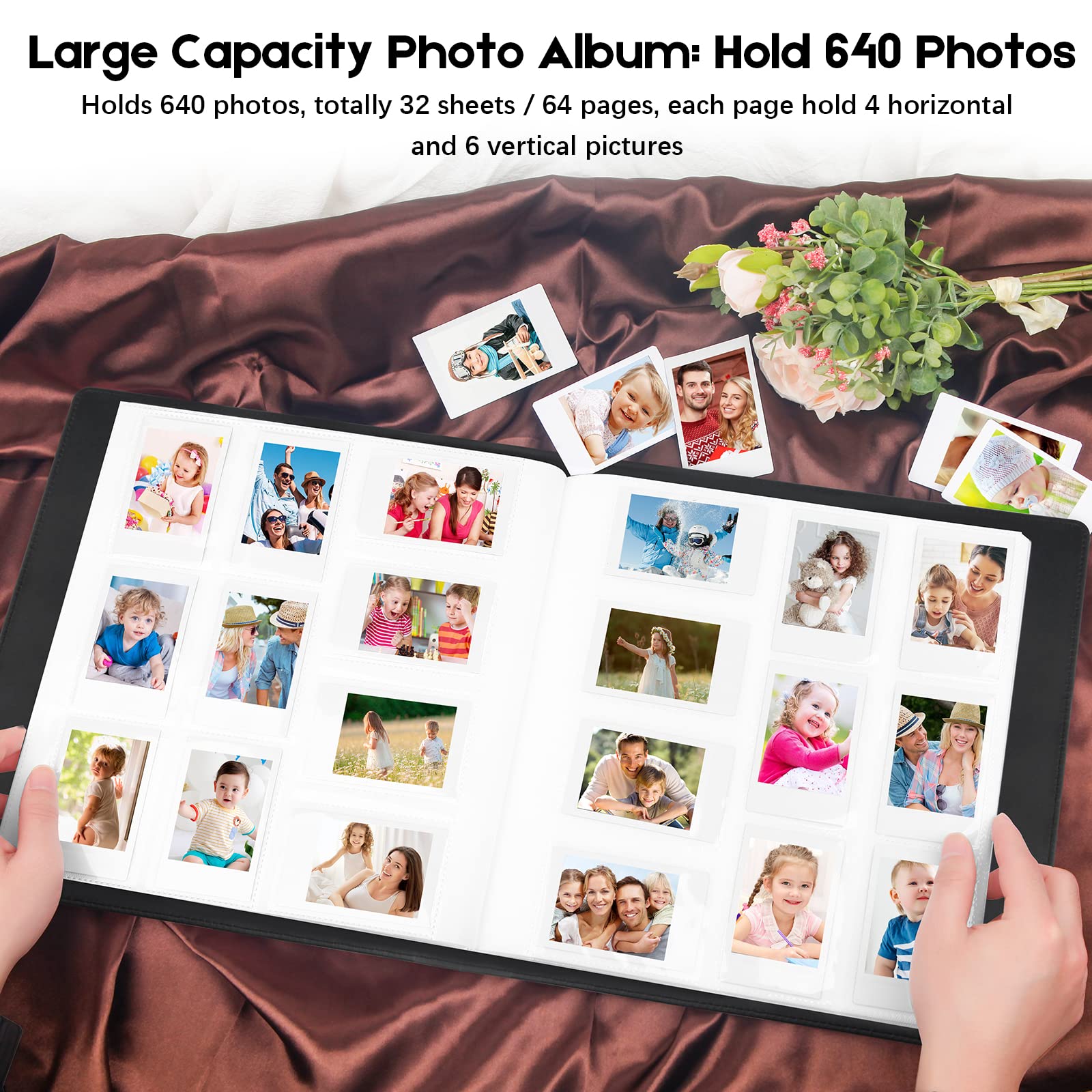DISPLAY 640 PHOTOS: Hold 640 pictures in total, this album contains 64 individual pages with 10 photos per page, opens like a book for easy viewing. Best for weddings, engagements, graduations, baby photos or other arty obsessions.