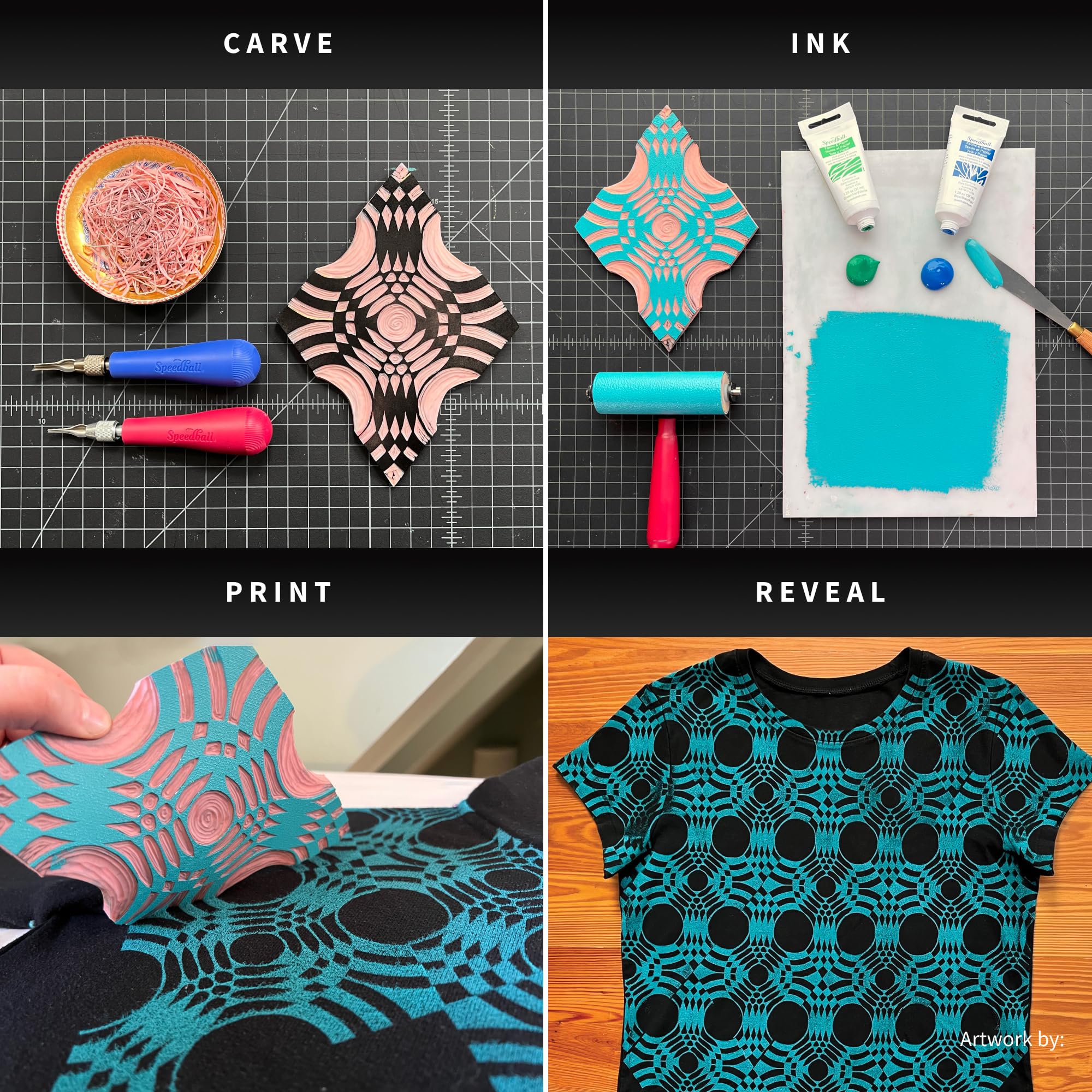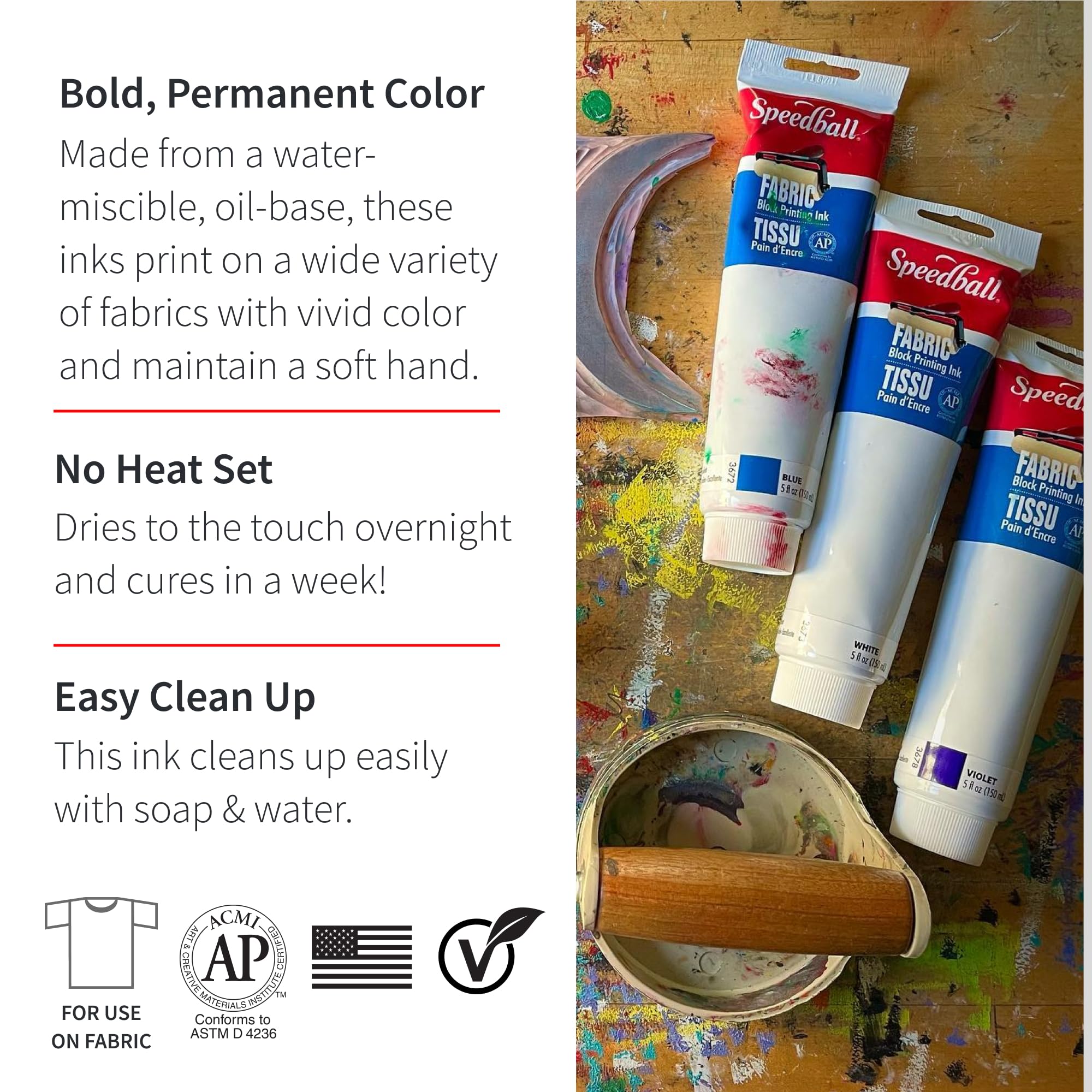 Love creating unique designs on fabric but hate heat-setting? Then Speedball’s Fabric Block Printing Inks are for you! Made from a water-washable oil, these inks print with bold, opaque color and maintain a soft hand. Available in 14 colors in 2. 5oz and 5oz sizes. All colors carry the AP Seal and clean up easily with soap and water.
