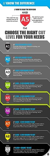 Durable Hand Protection: Features ANSI level A5 cut protection, ANSI level 5 abrasion resistance, ANSI level 4 puncture resistance, and ANSI level 2 impact resistance.