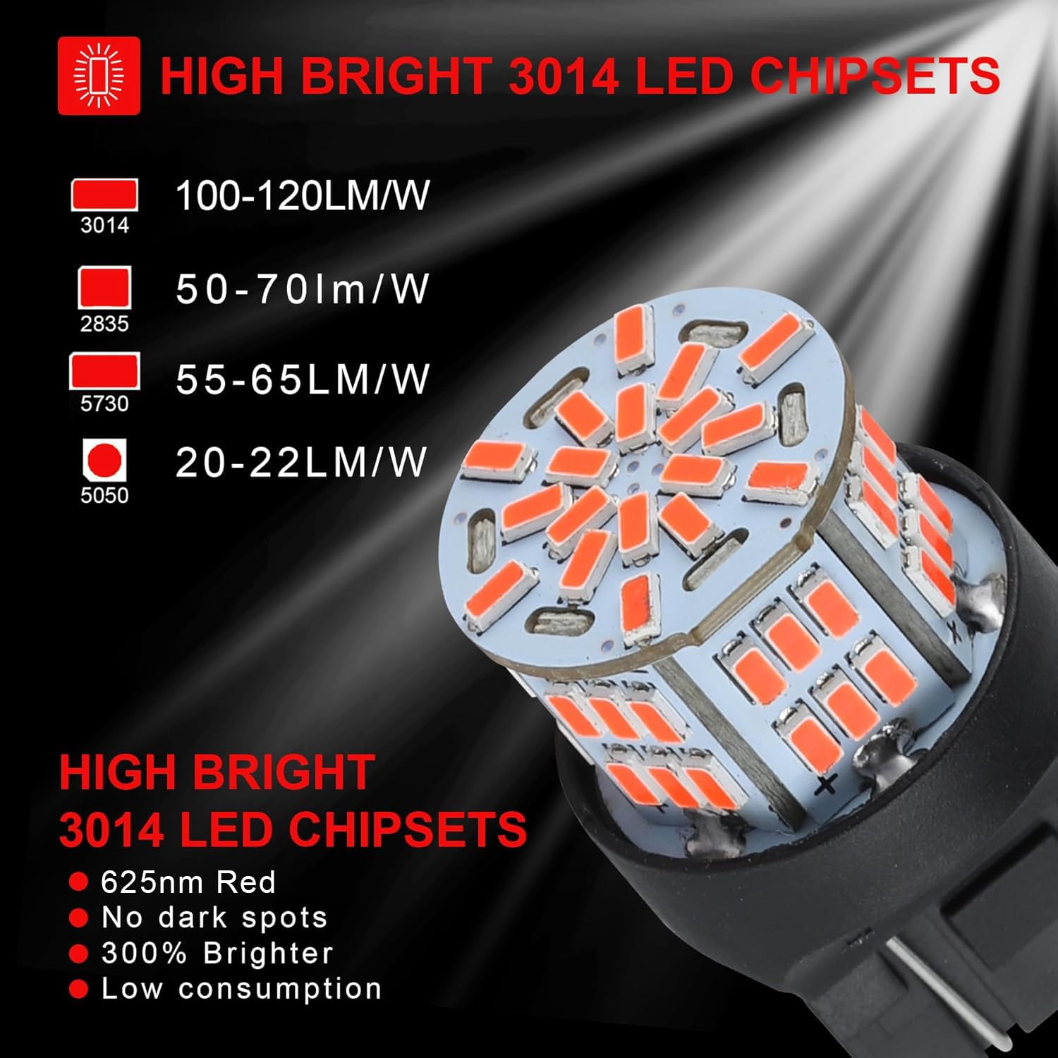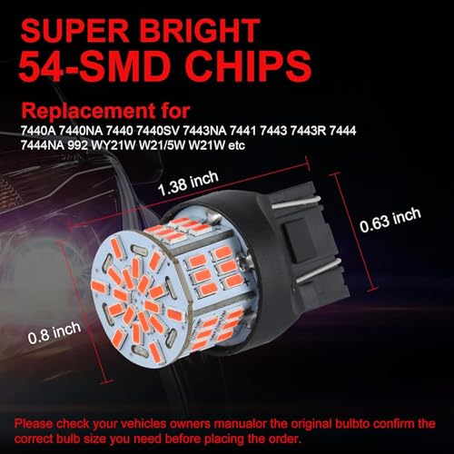 Key Specs: Voltage DC 12V-24V, 625nm Brilliant Red, Wattage 3w, low power consumption and fast heat dissipation for longer lifespan. The 7443 led light bulbs are compatible with 7440A 7440NA 7440 7440SV 7443NA 7441 7443 7443R 7444 7444NA 992 WY21W W21/5W W21W etc.