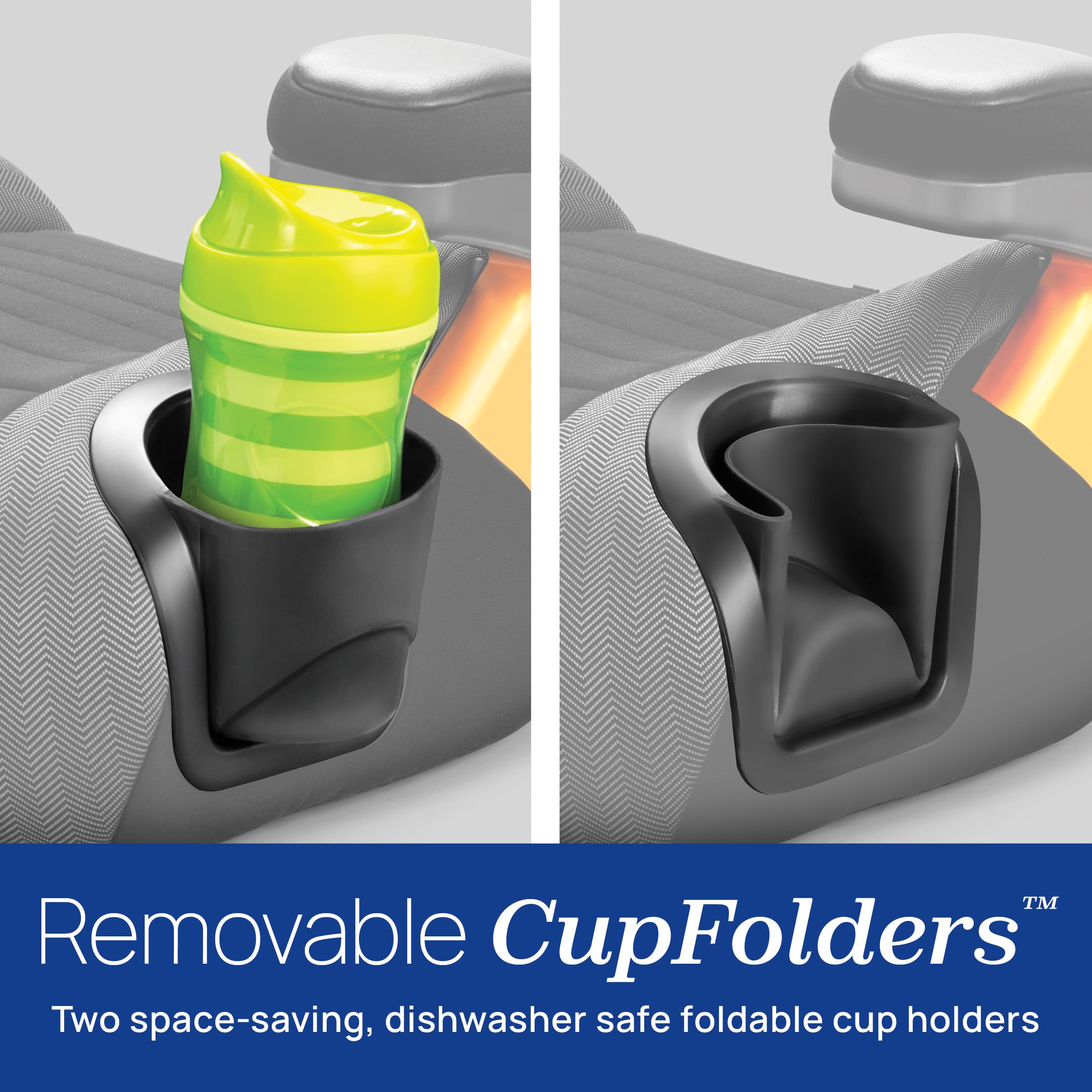 EASY CARE — The GoFit ClearTex Plus portable booster seat features 2 dishwasher-safe, fold-away cup holders, a machine-washable seat pad and pop-out armrest covers for easy cleaning. The foam insert may be hand rinsed and hung to dry.
