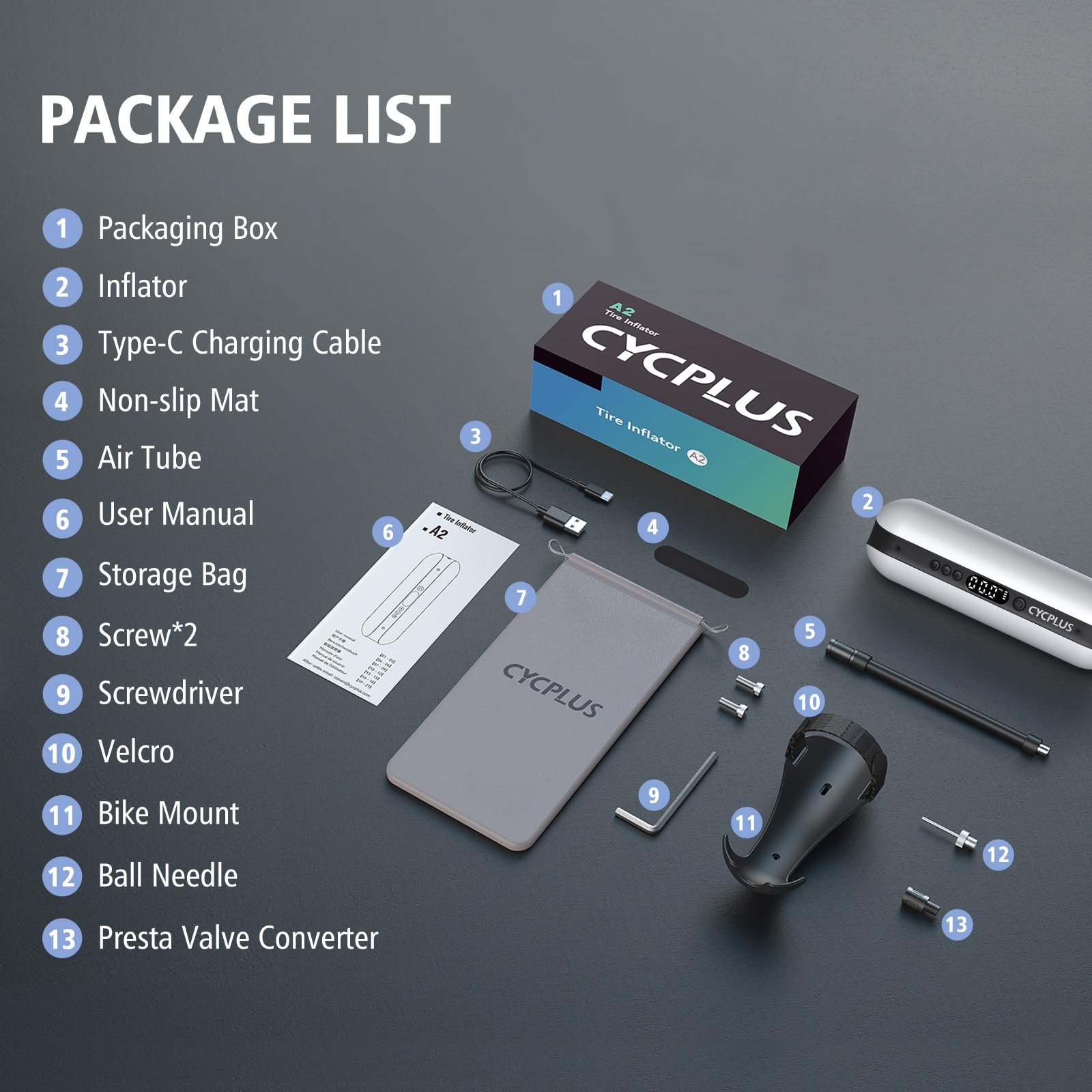 【150PSI Fast Inflation】CYCPLUS Portable Air Compressor delivers 150 PSI/10.3 Bar, allowing you to fully inflate a bike tire in just 2 minutes. It comes with Presta and Schrader valve adapters, as well as a ball needle, making it compatible with mountain bikes, road bikes, motorcycles, car tires, and sports balls.