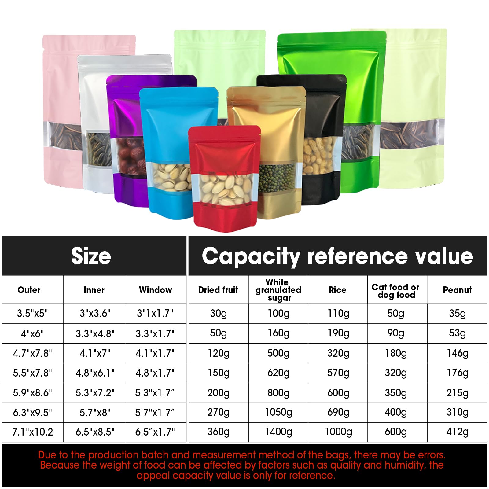【Thoughtful Design】Matte window of resealable mylar bags is helpful to distinguish the items in the bag.The stand-up design makes the food bags easier to display on the table.