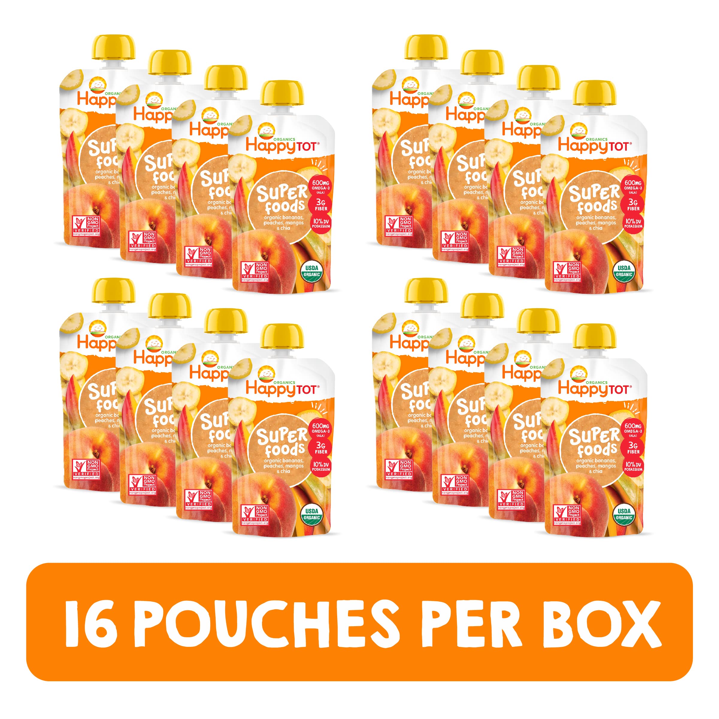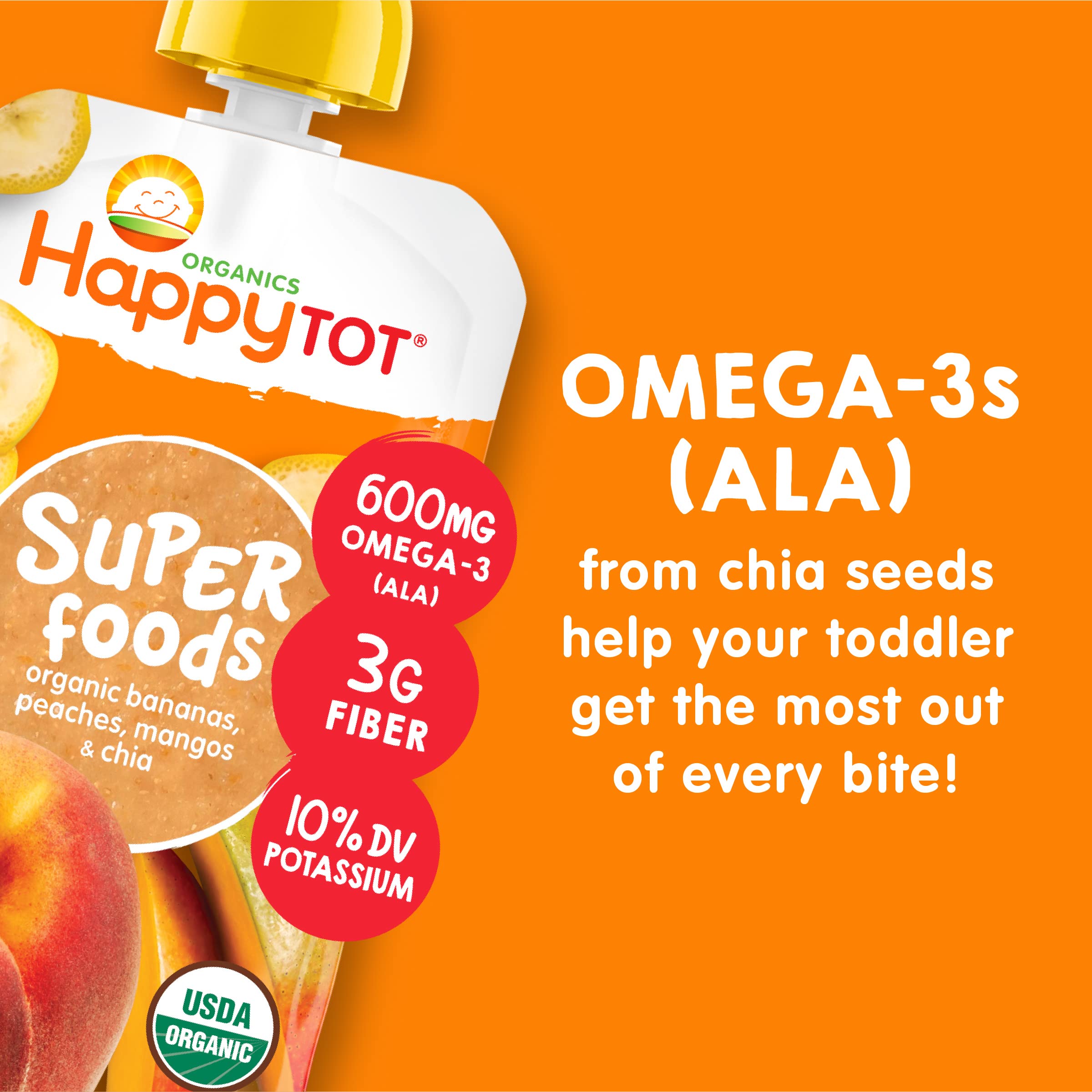 Happy Tot SuperFoods pouches help little ones get key nutrients from organic vegetables, fruits and chia, a source of Omega-3 (ALA). Made with wholesome ingredients selected to support this age and stage of totsβ development, this smooth puree is a delicious blend of tasty fruits, complimentary veggies, and nourishing chia seeds. For your picky eaters and active toddlers! Itβs convenient, nutritious snacking anytime, anywhere β grab these superfoods for your super tot!