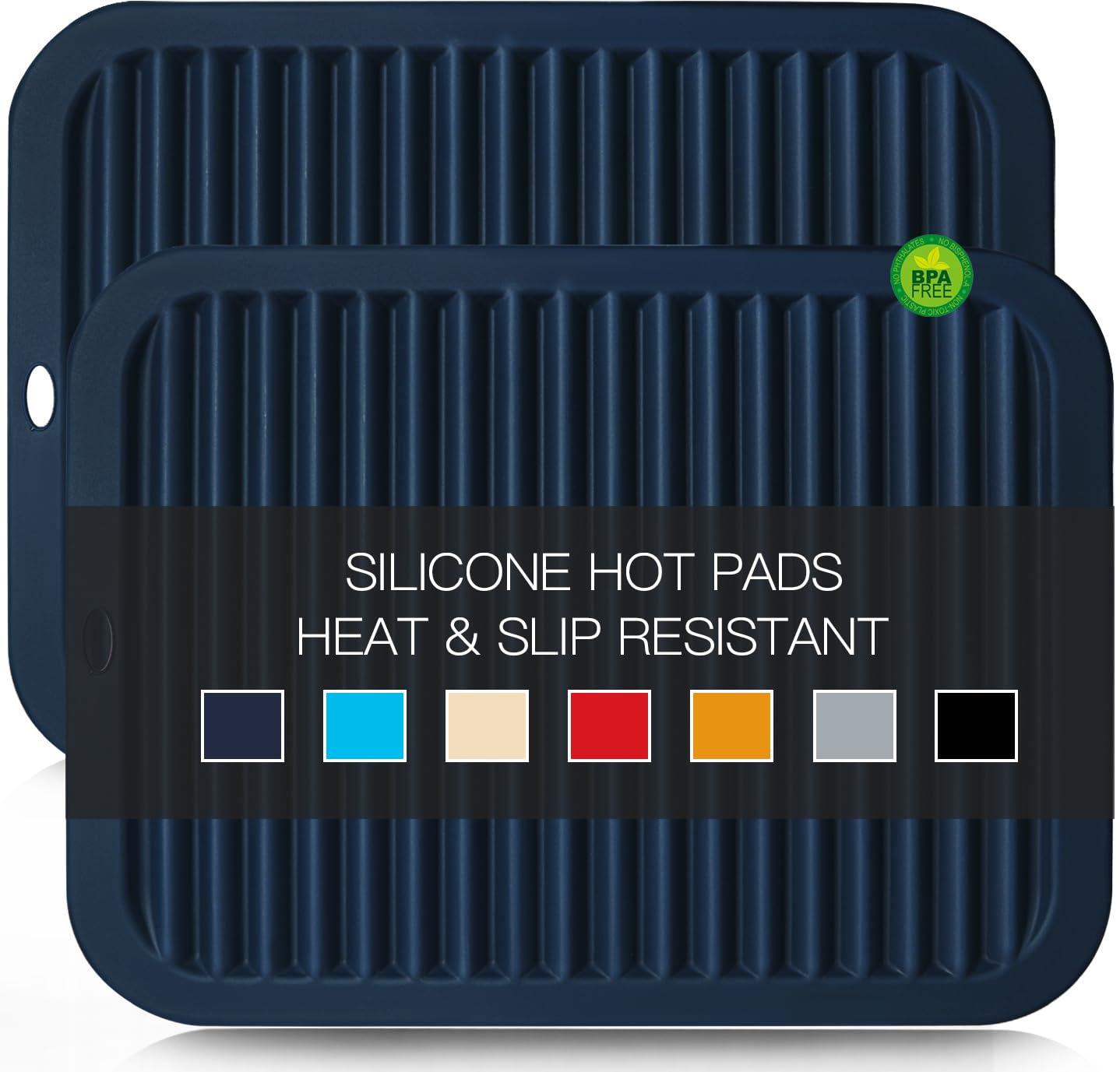 🥘Versatile & Multipurpose Mats: Use the large heat resistant silicone mats as a hot pad, countertop protector, pot holder, jar opener, spoon rest, dish drying mat, teapot mat or anywhere you need extra grip. The square navy blue trivet is also perfect for use in an oven, microwave, air fryer, or freezer, protecting kitchen table from hot and cold damage.
