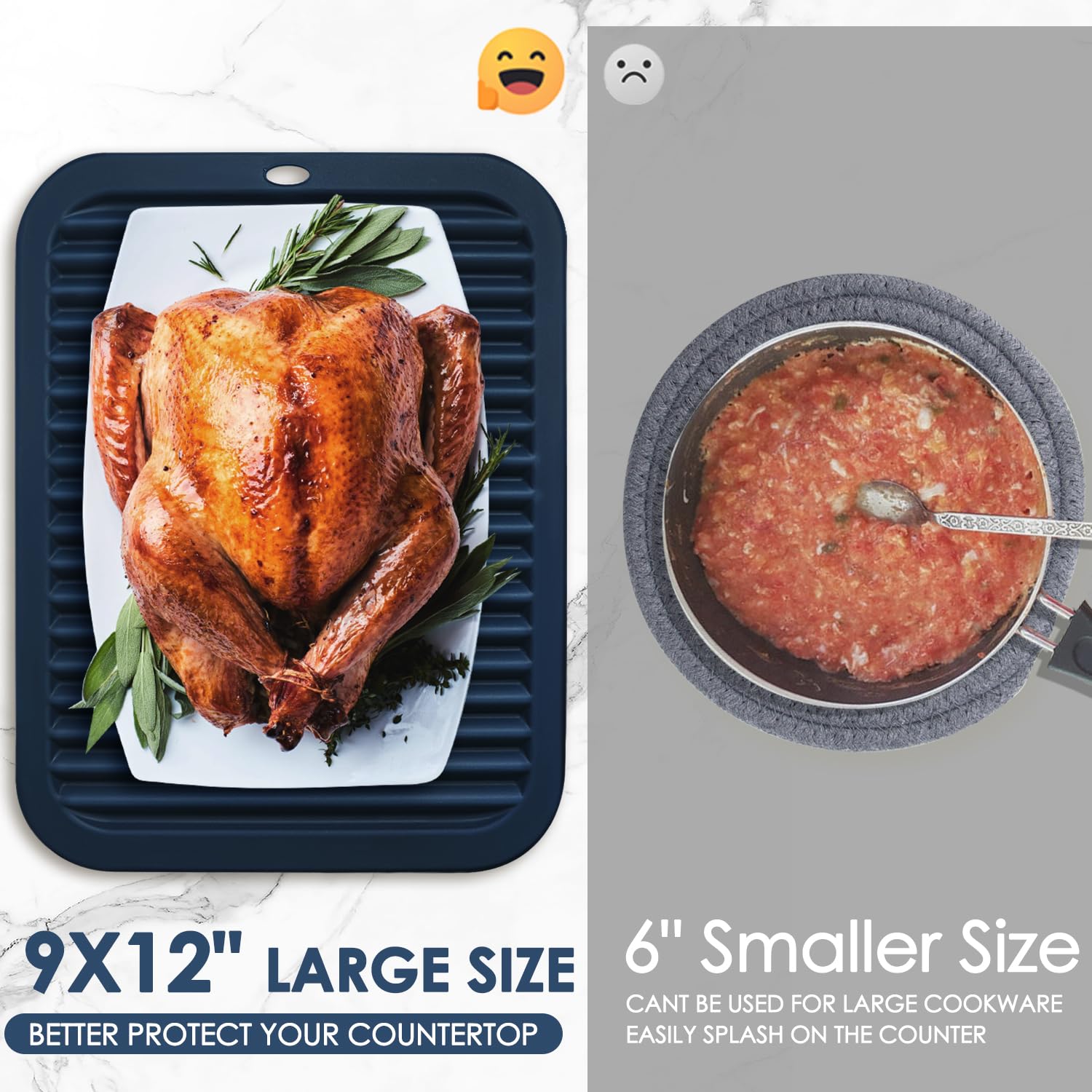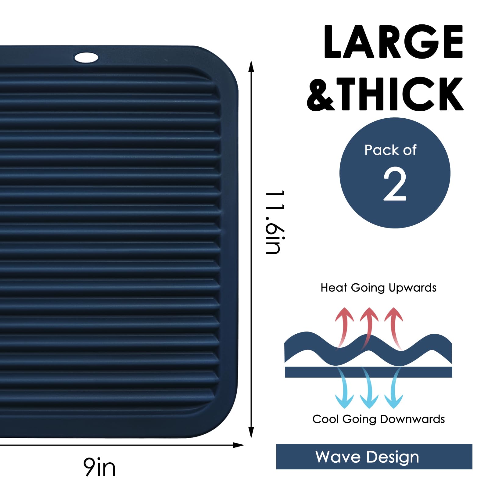 🥘Large Size of Rectangular Trivets: Our navy blue large silicone trivet with 9x11.6 Inches, leak-proof, nonstick, and lightweight, use the blue kitchen drying mat to replace old placemats, bulky oven mitts, or place pads under toasters or air fryers.