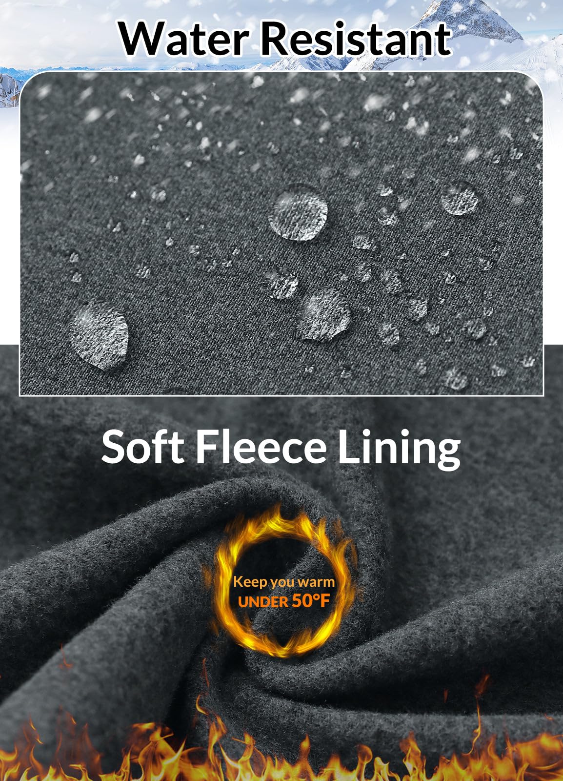 Feel the cold? Put on these fleece lined pants. These high waist yoga pants with pockets with soft fleece lining keep you super comfy and warm under 50°F, the water-resistant fabric is outside to better keep from wind and keep you dry on a snowy day.