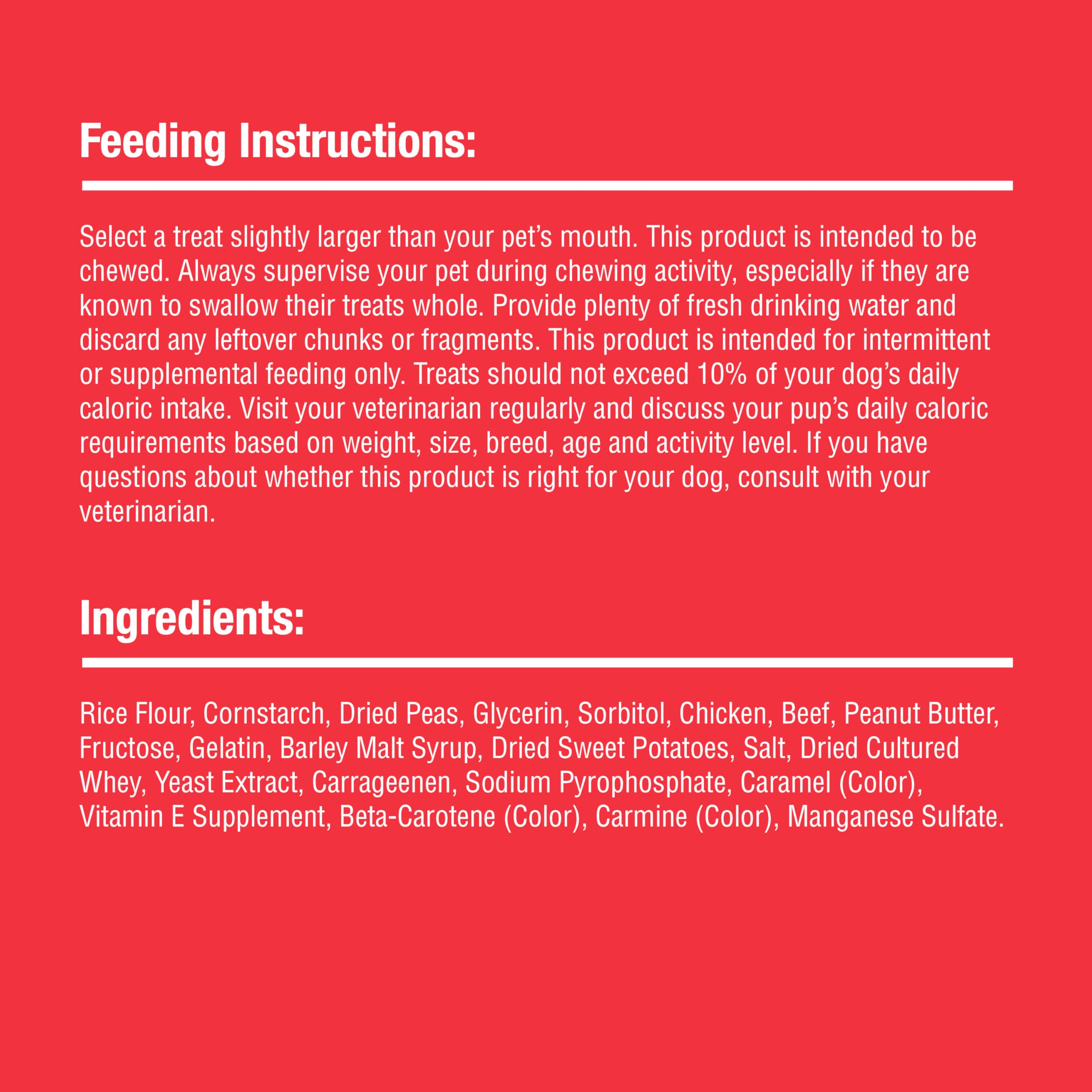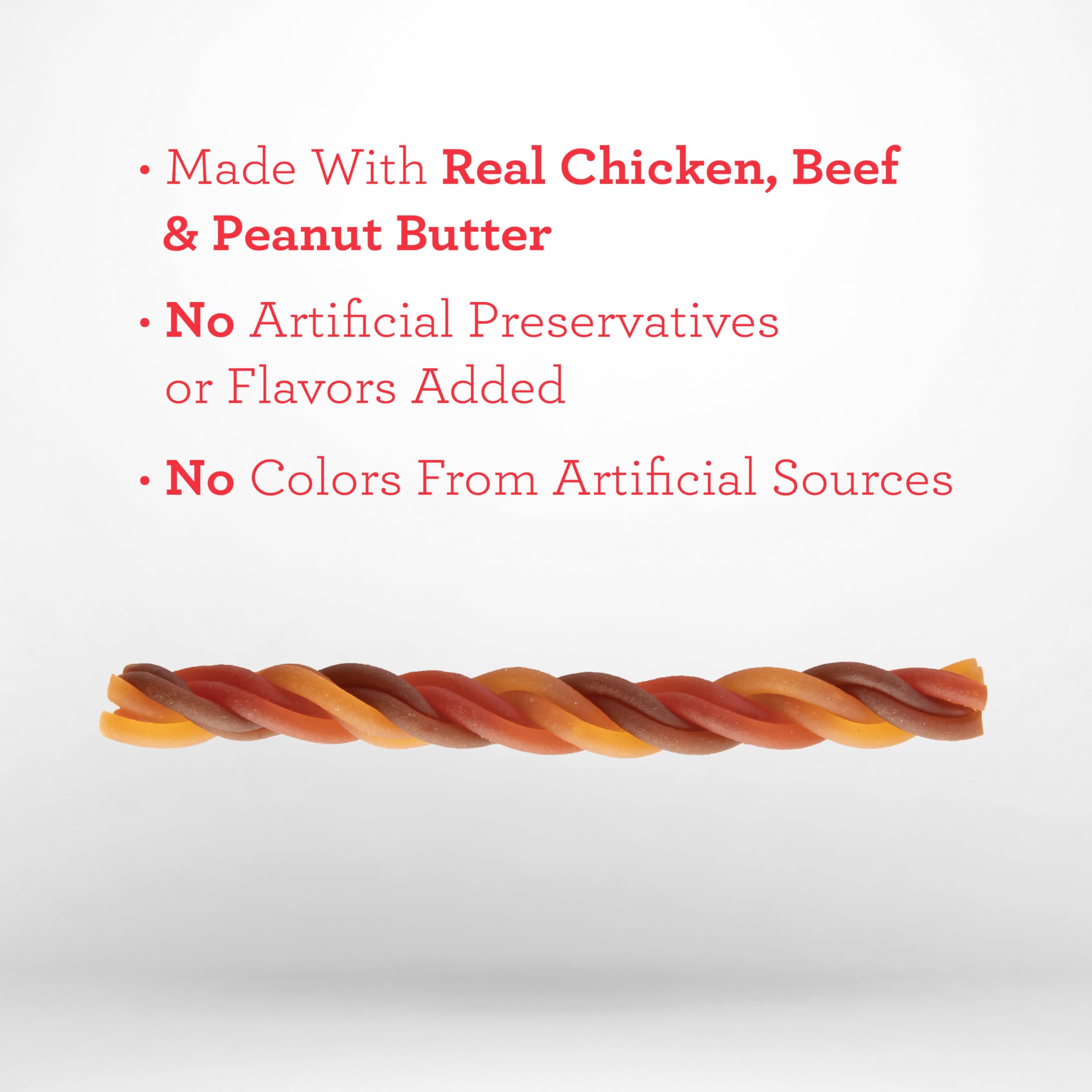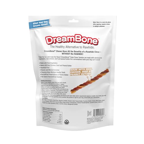 Rawhide-free DreamBone Triple Flavor Twisties are made with real vegetables, chicken, beef and peanut butter for a scrumptious taste dogs dream about. These chews are also vitamin- and mineral-enriched. You’ll love that they’re made with no artificial preservatives or flavors added and no colors from artificial sources. Your furry friend will love the 100% delicious, irresistible taste! Plus, chewing helps them maintain healthy teeth. Select a treat slightly larger than your pet’s mouth. This product is intended to be chewed. Always supervise your pet during chewing activity, especially if they are known to swallow their treats whole. Provide plenty of fresh drinking water and discard any leftover chunks or fragments. This product is intended for intermittent or supplemental feeding only. Treats should not exceed 10% of your dog’s daily caloric intake. Visit your veterinarian regularly and discuss your pup’s daily caloric requirements based on weight, size, breed, age, and activity level. If you have questions about whether this product is right for your dog, consult with your veterinarian.