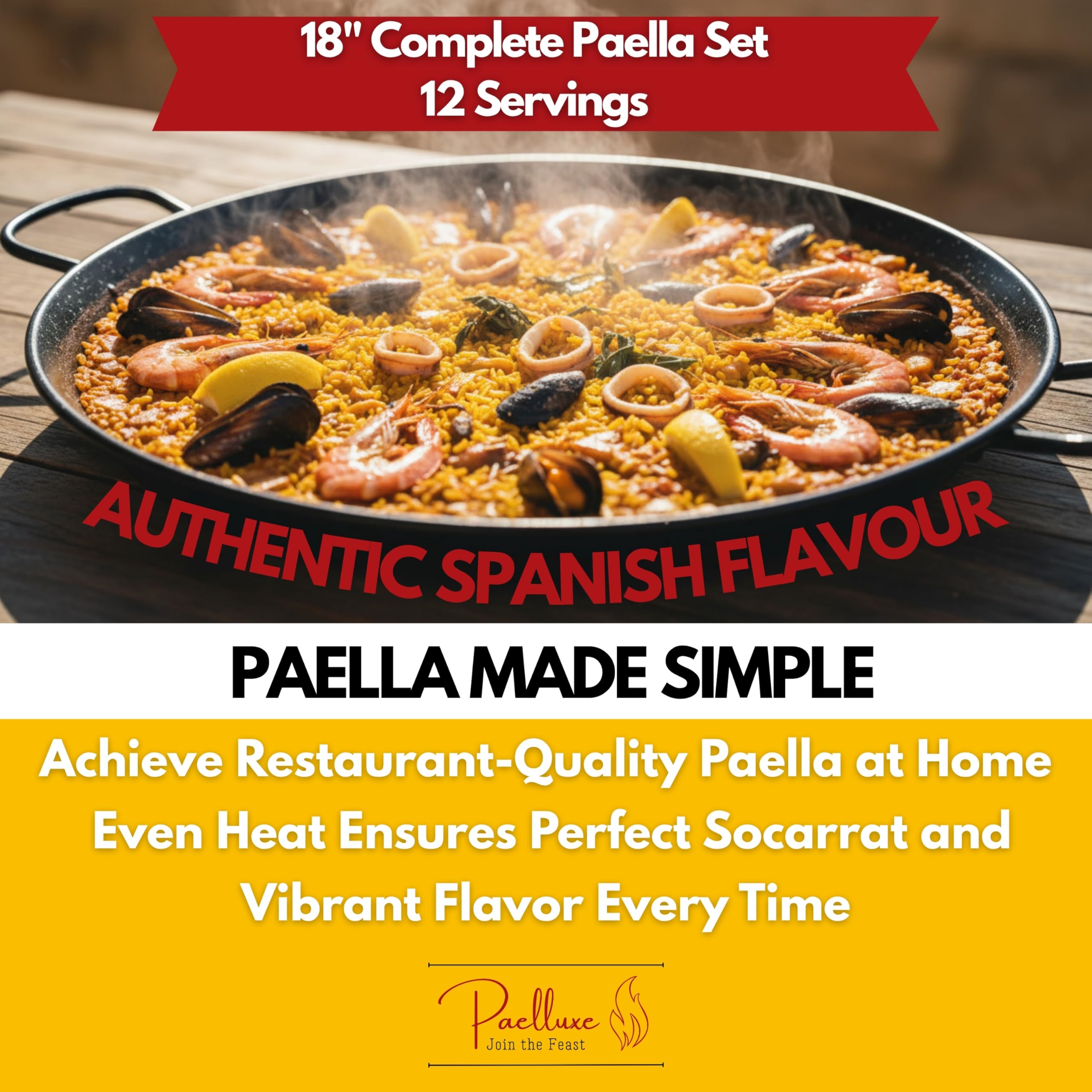 FULLY-EQUIPPED OUTDOOR COOKING PACKAGE: Paelluxe proudly offers a comprehensive Paella Burner and Stand Set, featuring an 18-inch anti-rust enamelled paella pan, a high-performance burner, a durable stand, gas hose with regulator, weather-resistant outdoor cover, and a wind-resistant windshield. Ready to use straight out of the box, no extra accessories required. (Propane Gas Tank Not Included)