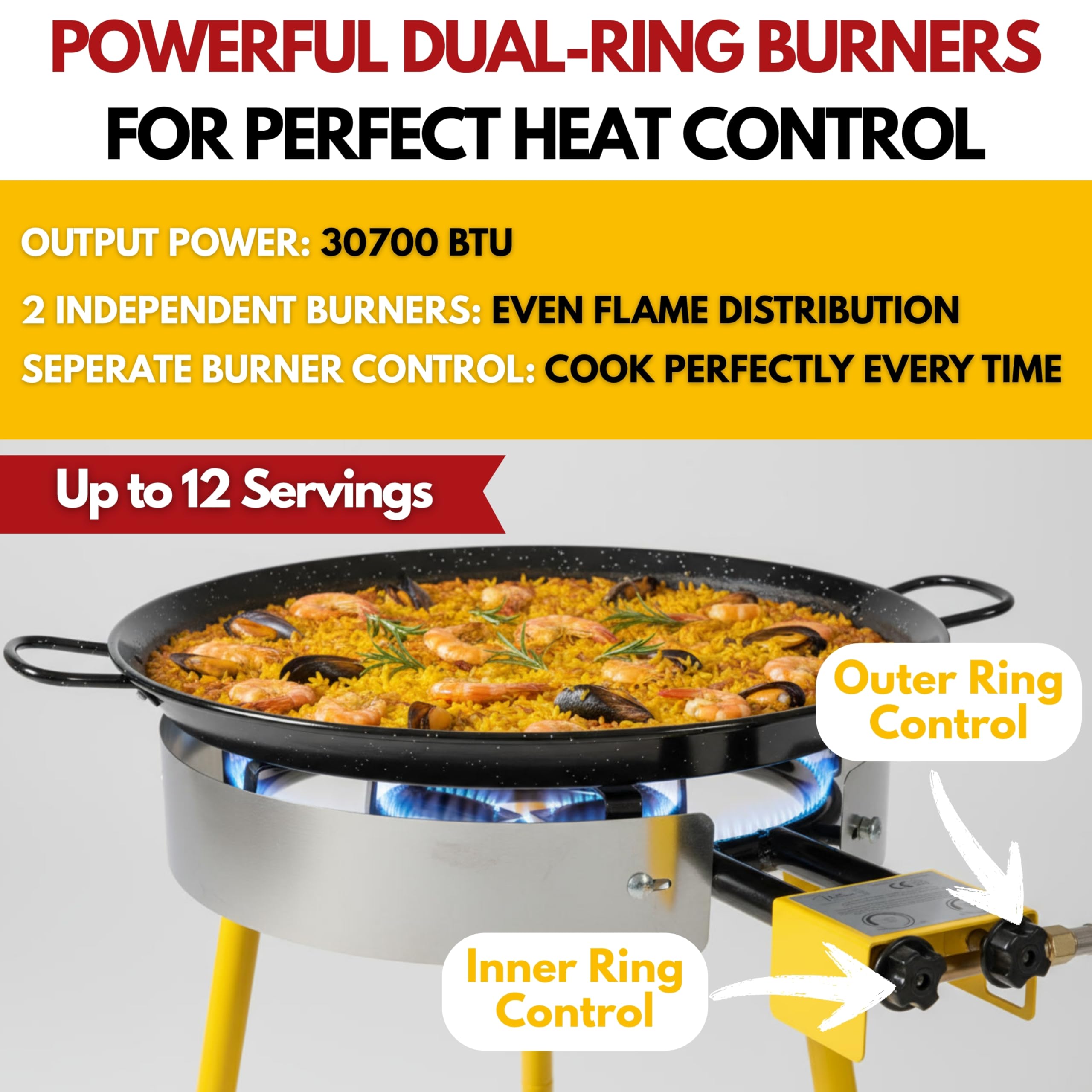 EXCEPTIONAL FUNCTIONALITY: Featuring a sturdy double gas burner propane output of (9 KW), Paelluxe Paella Cooking Set Burner delivers top-notch performance. Safety is a priority, evident through its CE certification, while the included hose with regulator ensures a secure cooking experience whenever you activate these outdoor gas burners.
