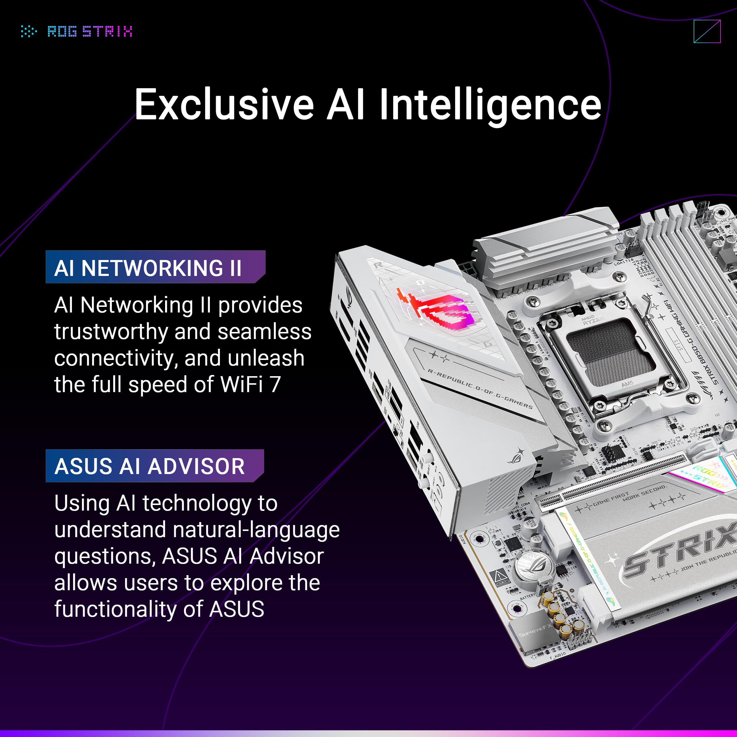 Intelligent Control: ASUS AI Advisor, AI Networking II and AEMP to simplify setup and improve performance Unmatched Personalization: ASUS-exclusive Aura Sync RGB lighting, including three addressable Gen 2 headers