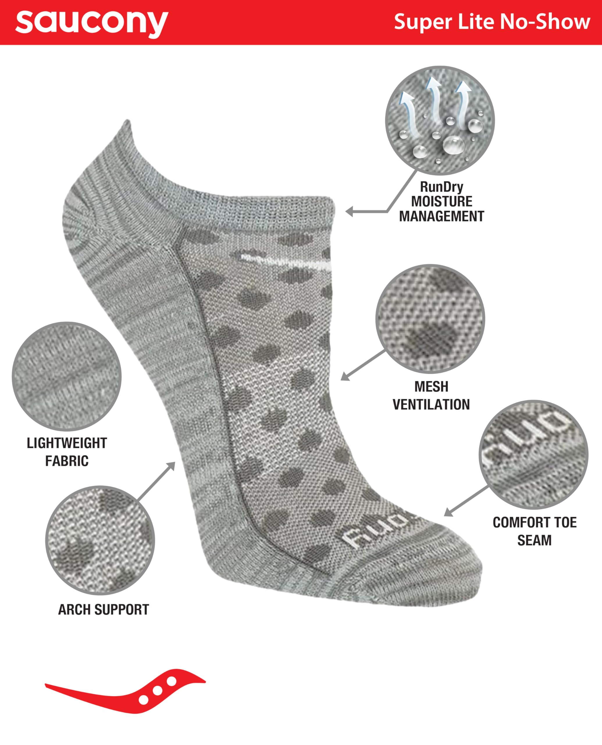 Description Saucony women's performance super lite no show socks is a perfect combination of comfort and support. Great for the toughest training sessions. Features arch support and air mesh venting for lasting comfort. Run for Good - Saucony was founded way back in 1898. Ever since, we have been loyal to the sport, building goodness into every product and inviting millions around the world to run with us. At Saucony, we exist for runners, Runners inspire us, bringing us new idea, force us to be better, they drive our design and engineering. They keep us competitive. They keep us hungry. They keep us honest. This focus and passion fuels us as we strive to create the best running shoes and apparel on the planet. We leave work each day knowing we’ve done everything to make runners live just a little better.