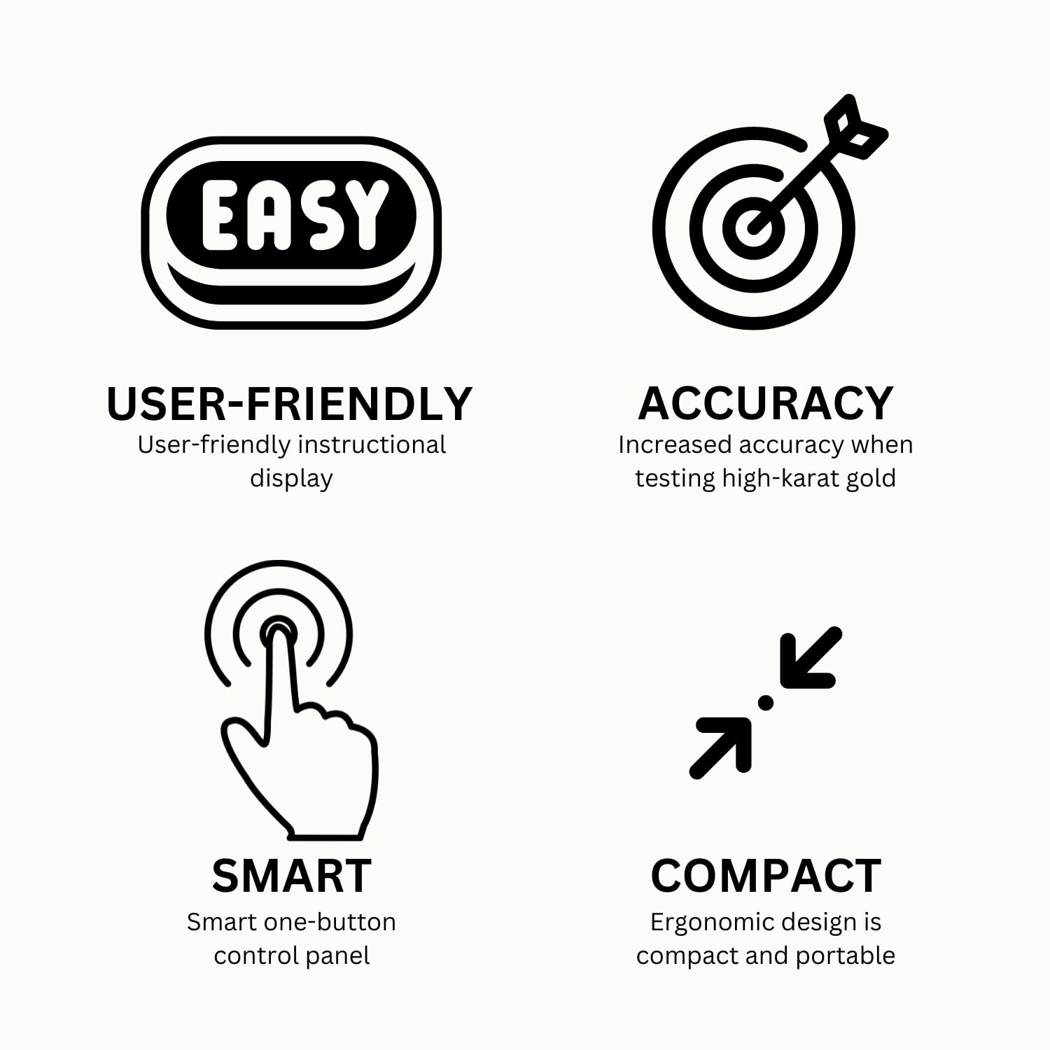 20% IMPROVED ACCURACY: This tester is the worldβs most user-friendly and best-performing handheld electronic gold tester. This handheld tester provides 20% improved accuracy for testing the purity of gold and platinum quickly, conveniently, and in the field. Its ergonomic design and easy-to-use features make it the go-to choice for goldsmiths and jewelry shop owners alike who need to test their gold and platinum quickly.