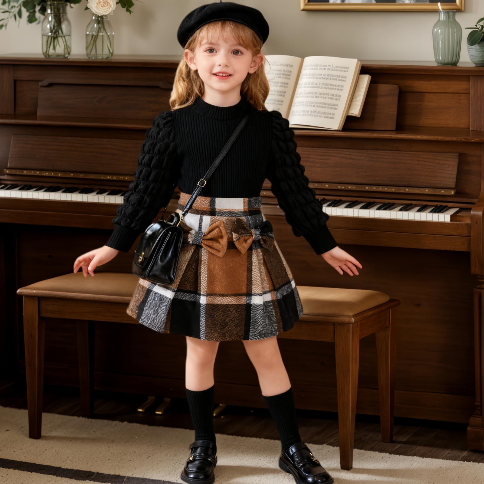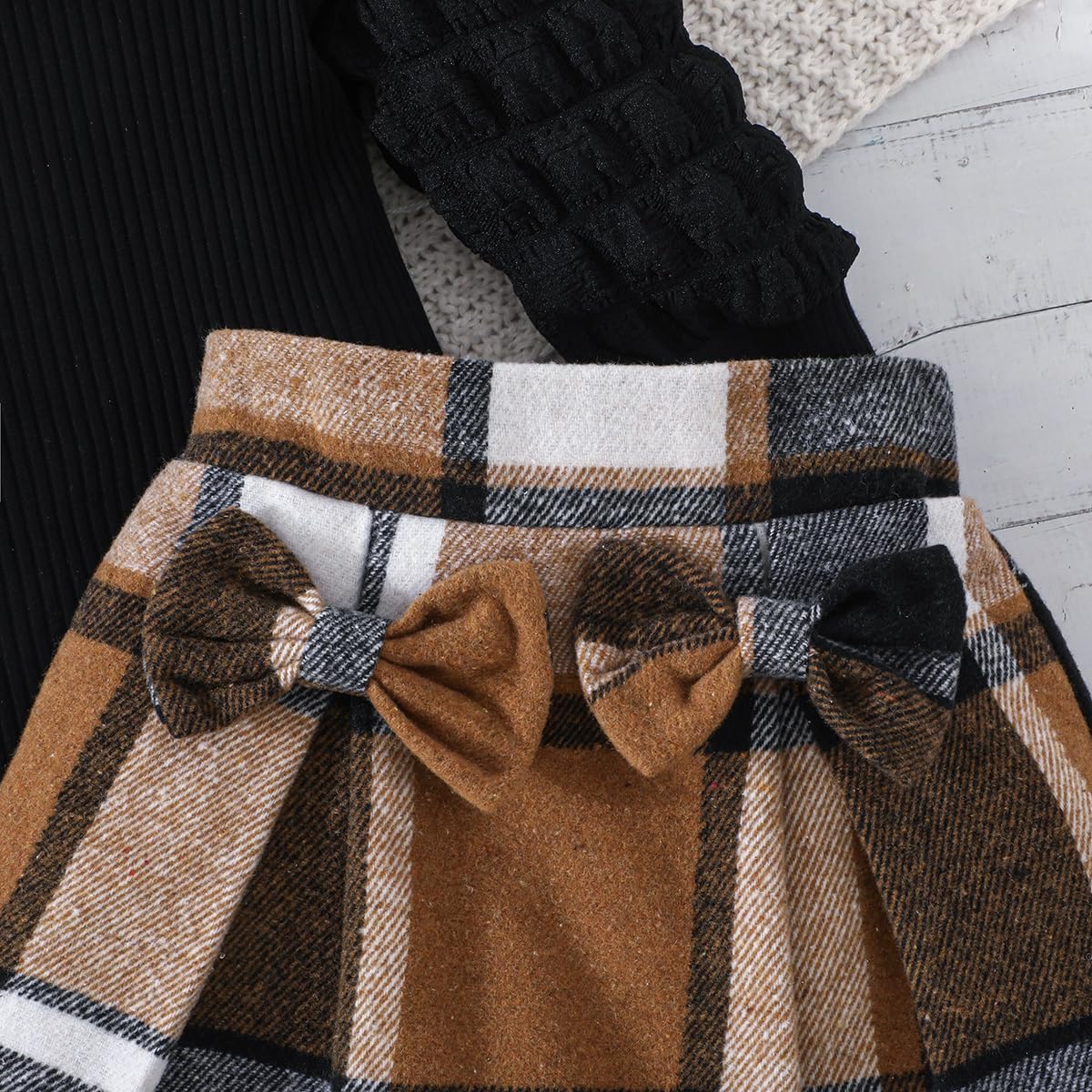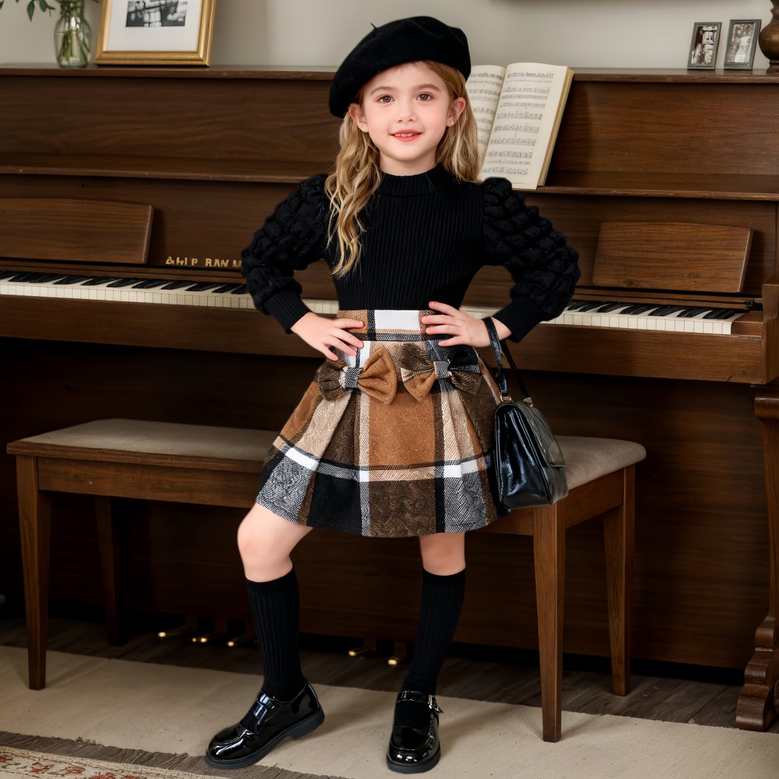 Feature: Toddler girl winter clothes,cute lantern puff sleeve, classic vintage brown plaid Skirtcomfy ribbed shirt and tweed plaid skirt set, girls plaid skirt with delicate bowknot decoration,lovely and stylish, Suitable for your little princess in autumn winter and Christmas wear.
