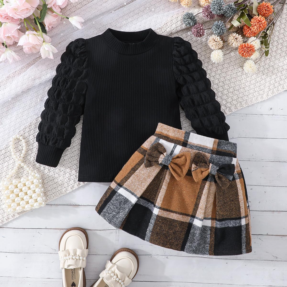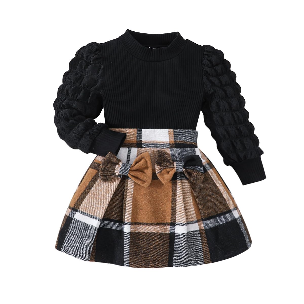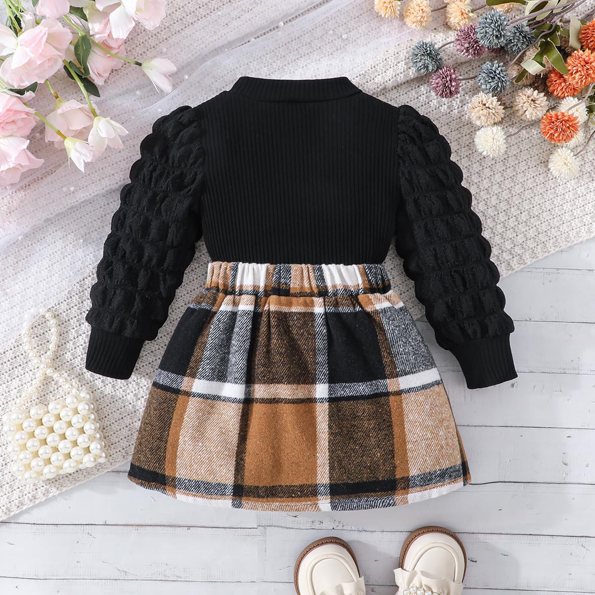 Feature: Toddler girl winter clothes,cute lantern puff sleeve, classic vintage brown plaid Skirtcomfy ribbed shirt and tweed plaid skirt set, girls plaid skirt with delicate bowknot decoration,lovely and stylish, Suitable for your little princess in autumn winter and Christmas wear.