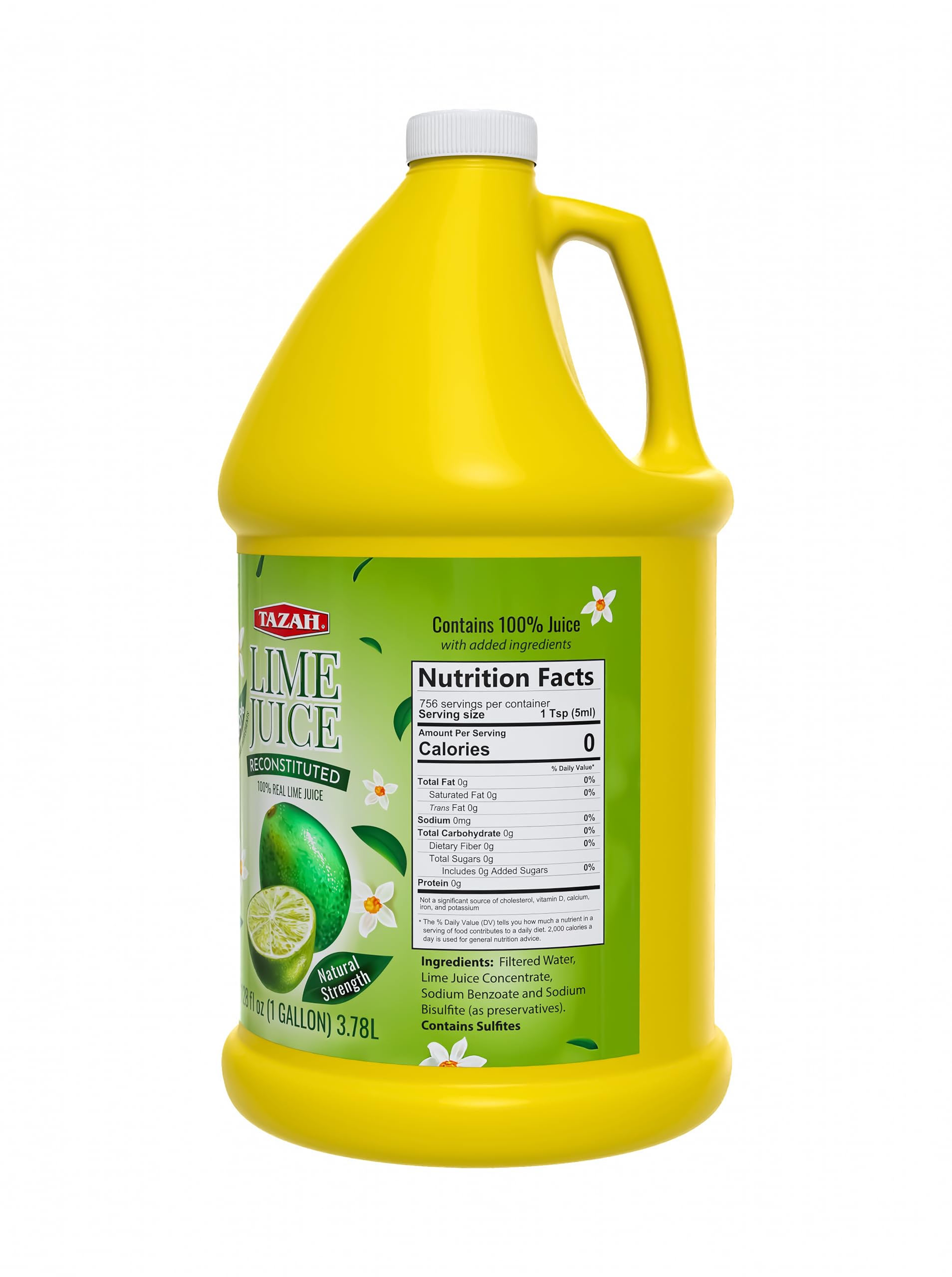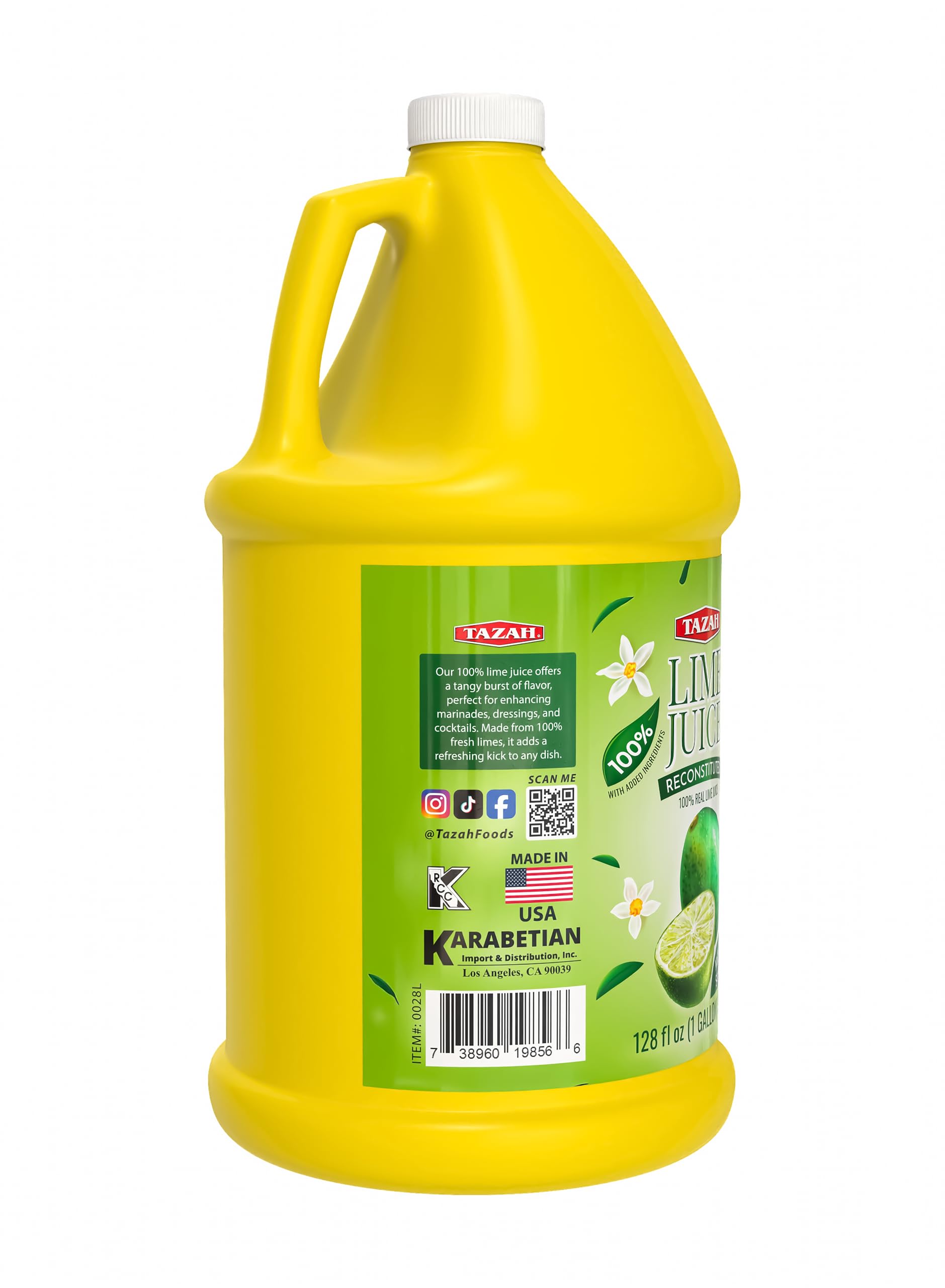 Tazah 100% Real Lime Juice – The Zest of Fresh Limes in Every Drop Experience the Bright, Tangy Flavor of Fresh-Squeezed Limes—Anytime, Anywhere Tazah Reconstituted Lime Juice is made from 100% real lime juice concentrate and filtered water, delivering the authentic flavor of fresh limes in a convenient, ready-to-use format. Whether you’re crafting cocktails, cooking savory dishes, or mixing dressings, Tazah makes it easy to enjoy real lime flavor without the mess or waste. ⸻ What is Reconstituted Lime Juice? Our juice is made by adding water back to lime juice concentrate, restoring it to its original strength and taste—just like freshly squeezed limes. You get the bold, tart flavor you love with the consistency and shelf life your kitchen needs. ⸻ Why Choose Tazah 100% Real Lime Juice? ✅ Made from Real Limes: No artificial lime flavor—just pure, 100% real lime juice. ✅ No Squeezing Required: Get the zing of lime instantly without cutting or squeezing. ✅ Long-Lasting Freshness: Stays fresh far longer than raw limes, perfect for bulk use. ✅ Versatile for Every Recipe: Ideal for cocktails, marinades, ceviche, salad dressings, salsas, and more. ✅ Consistent Quality: Same tart, citrusy flavor in every bottle—perfect for recipes needing precise acidity. ✅ Kosher Certified: Meets strict dietary and quality standards. ✅ Made in California, USA: Proudly manufactured with care and high standards. ⸻ Perfect for Home or Food Service Available in a generous 128 fl oz (1 gallon) size, it’s the ideal choice for households, restaurants, bars, food trucks, and catering services. ⸻ Ingredients: Filtered Water, Lime Juice Concentrate (100% real lime juice), Preservatives (Sodium Benzoate, Sodium Bisulfite). ⸻ Elevate Your Cooking and Cocktails From margaritas and mojitos to guacamole, marinades, and desserts—Tazah Lime Juice delivers pure lime goodness with unbeatable convenience.