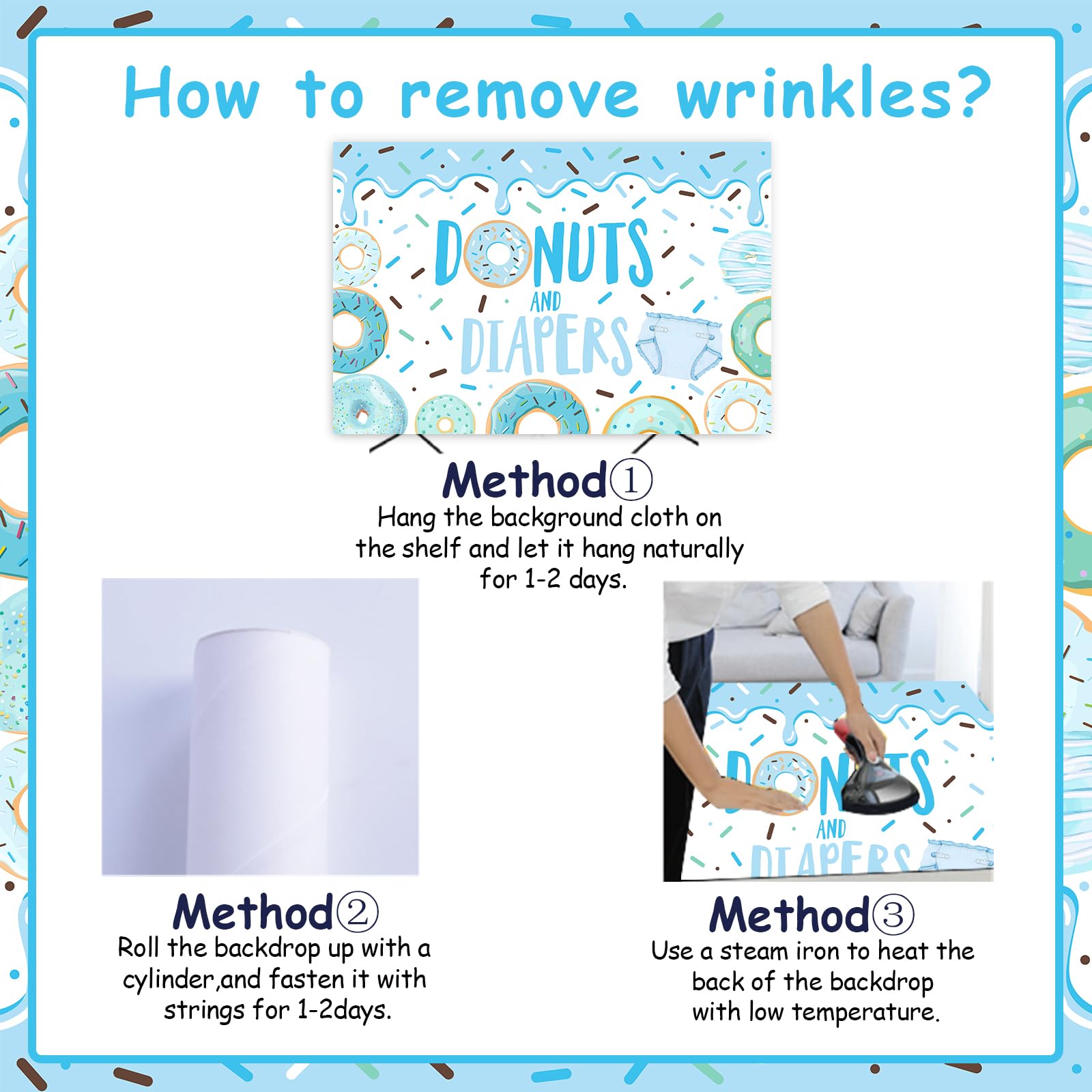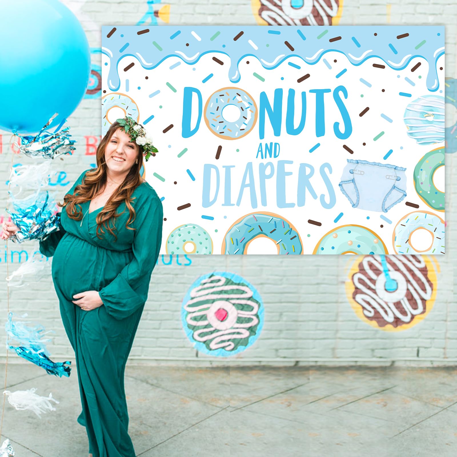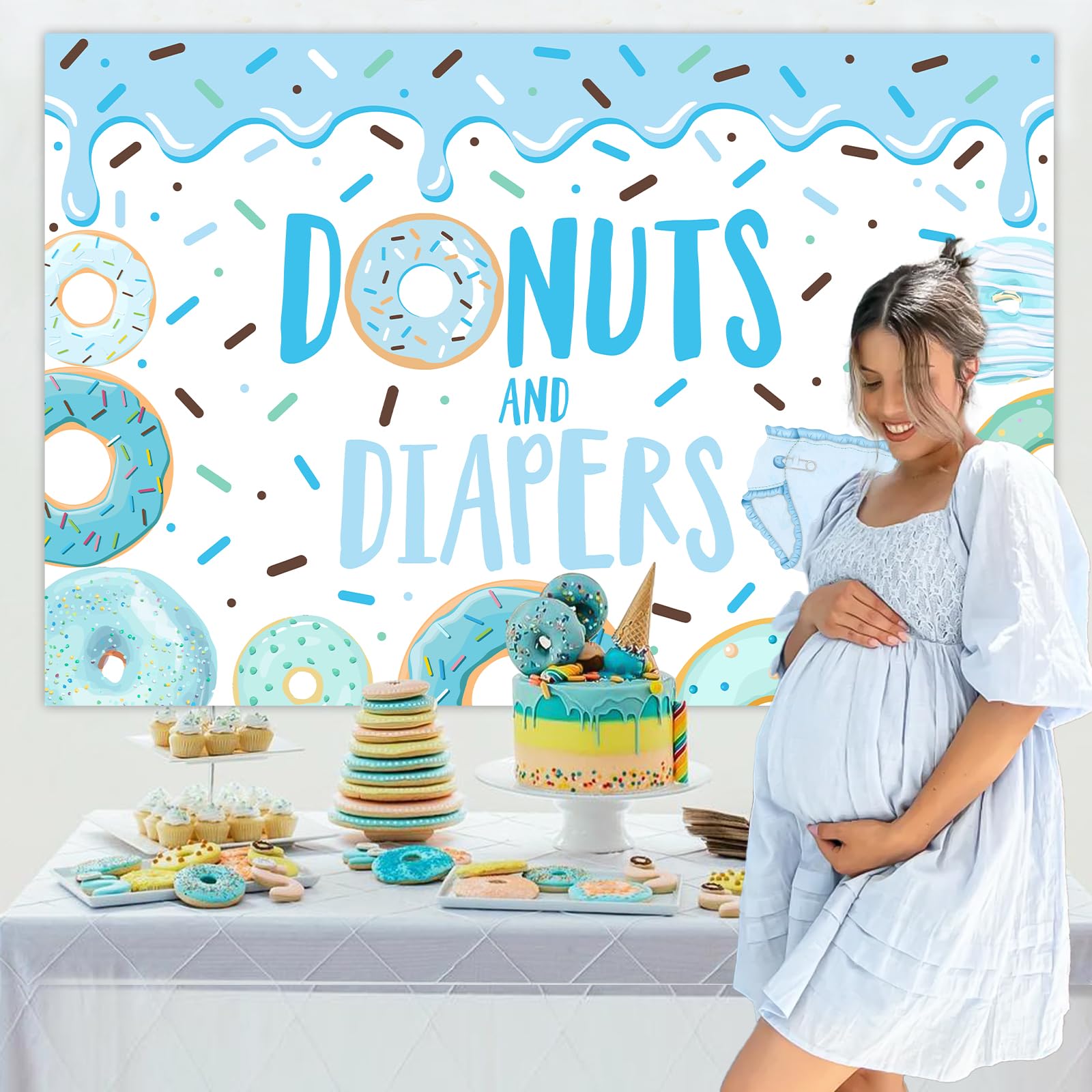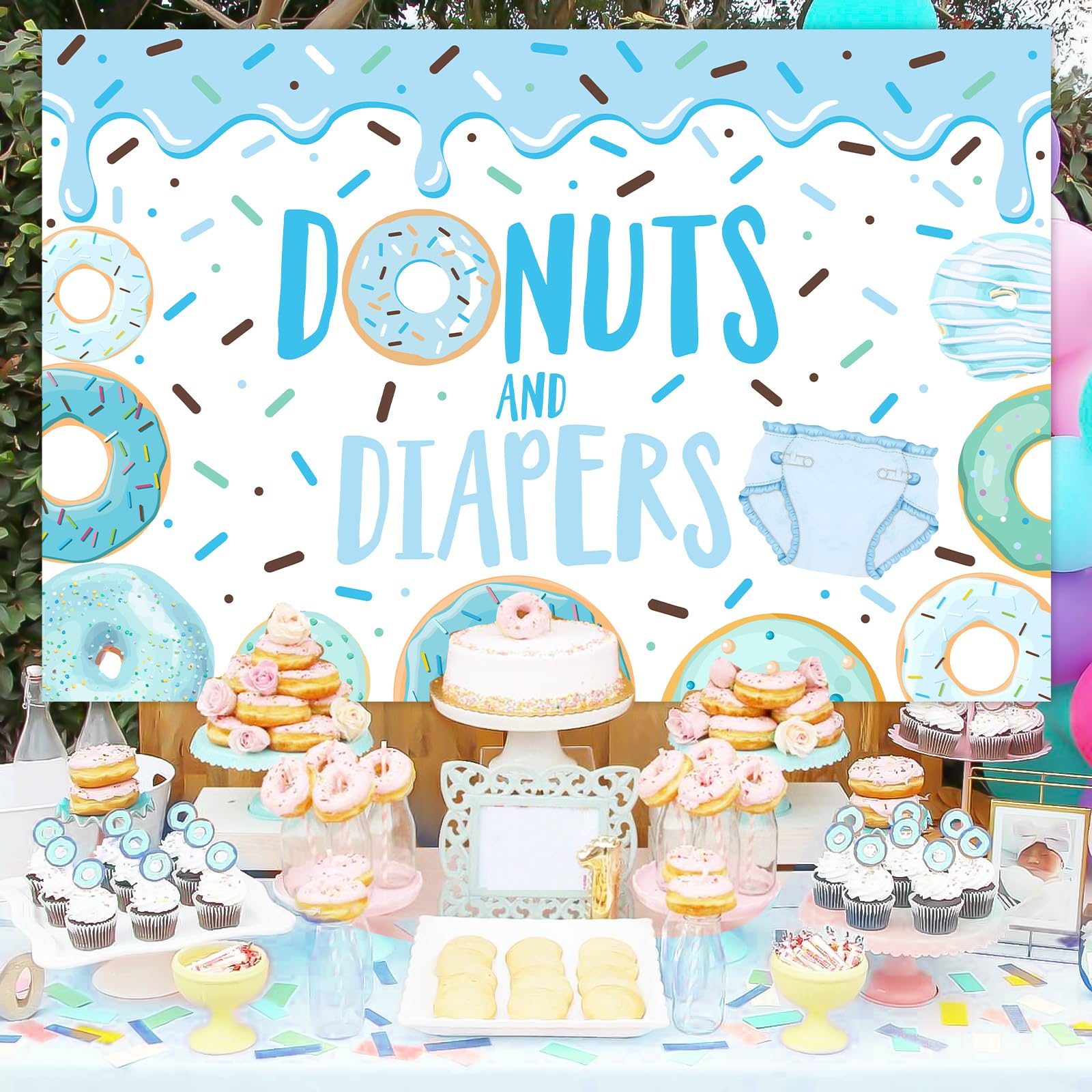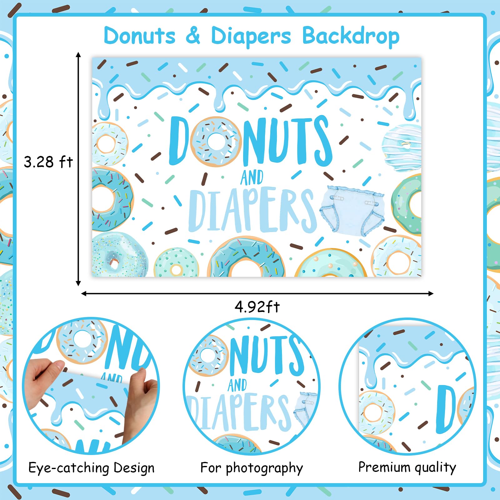 What you will receive: 1 x blue donuts and diapers background backdrop 3.28*4.92ft, which is beautiful and eye-catching for your party guests.