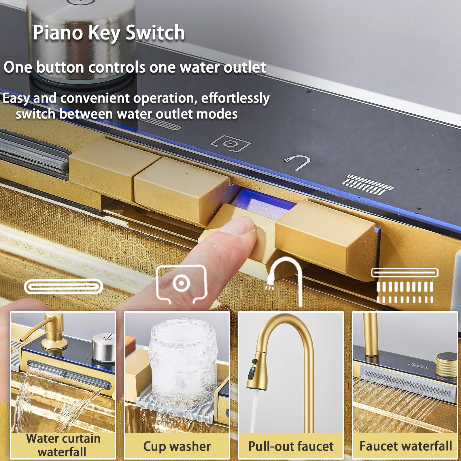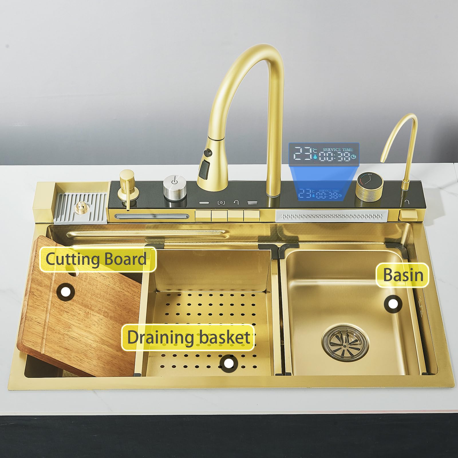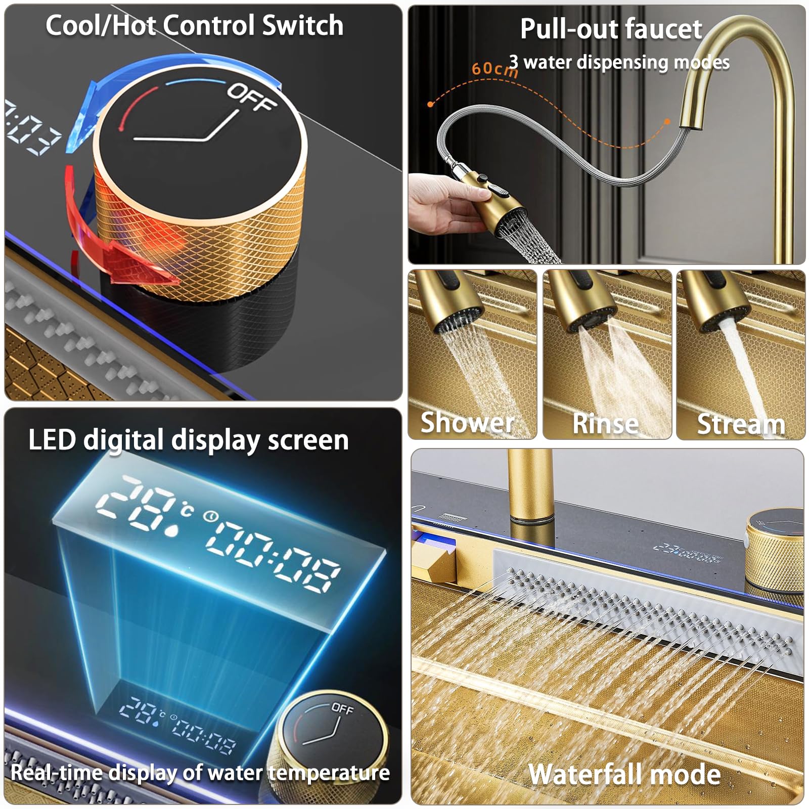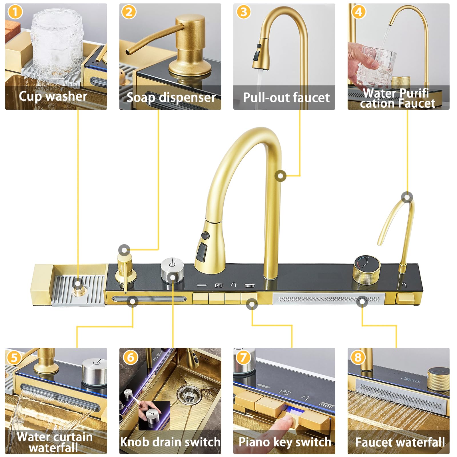 【State-of-the-art integrated technology】Experience the faucet of the future with cup washer, curtain waterfall, soap dispenser, table control, pull-out faucet and digital waterfall. Perfect combination of functionality and aesthetics.