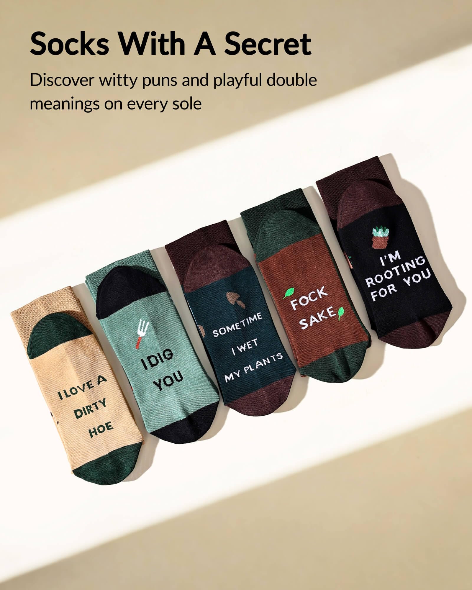 Unleash The Garden-Themed Adult Humor:Specially designed for men with a cheeky sense of humor, each sock sole features a different gardening pun with a playful double meaning, like "I Love Dirty Hoe" and "Sometime I Wet My Plants". It's our secret garden of witty jokes that will make him grin from ear to ear.