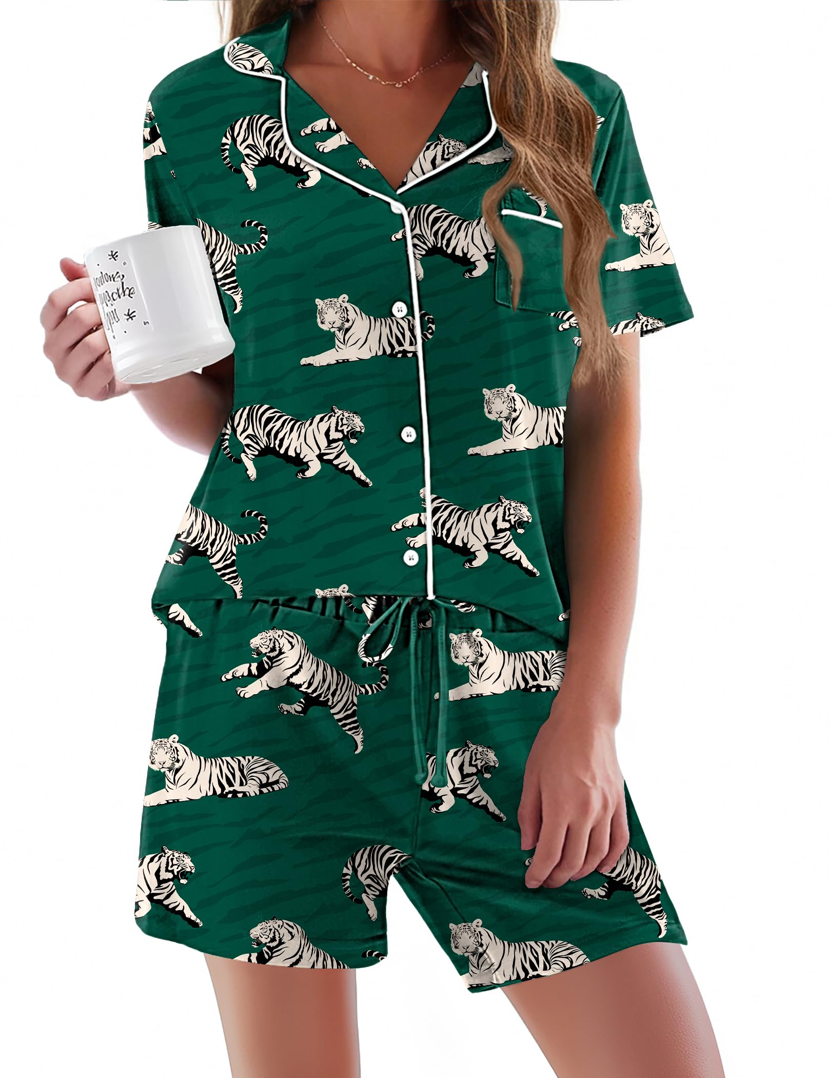 HUMANIZATION DESIGN: Features a hip-length button-down top with notch collar and chest pocket. Shorts include a chiffon drawstring elastic waist for maximum comfort.