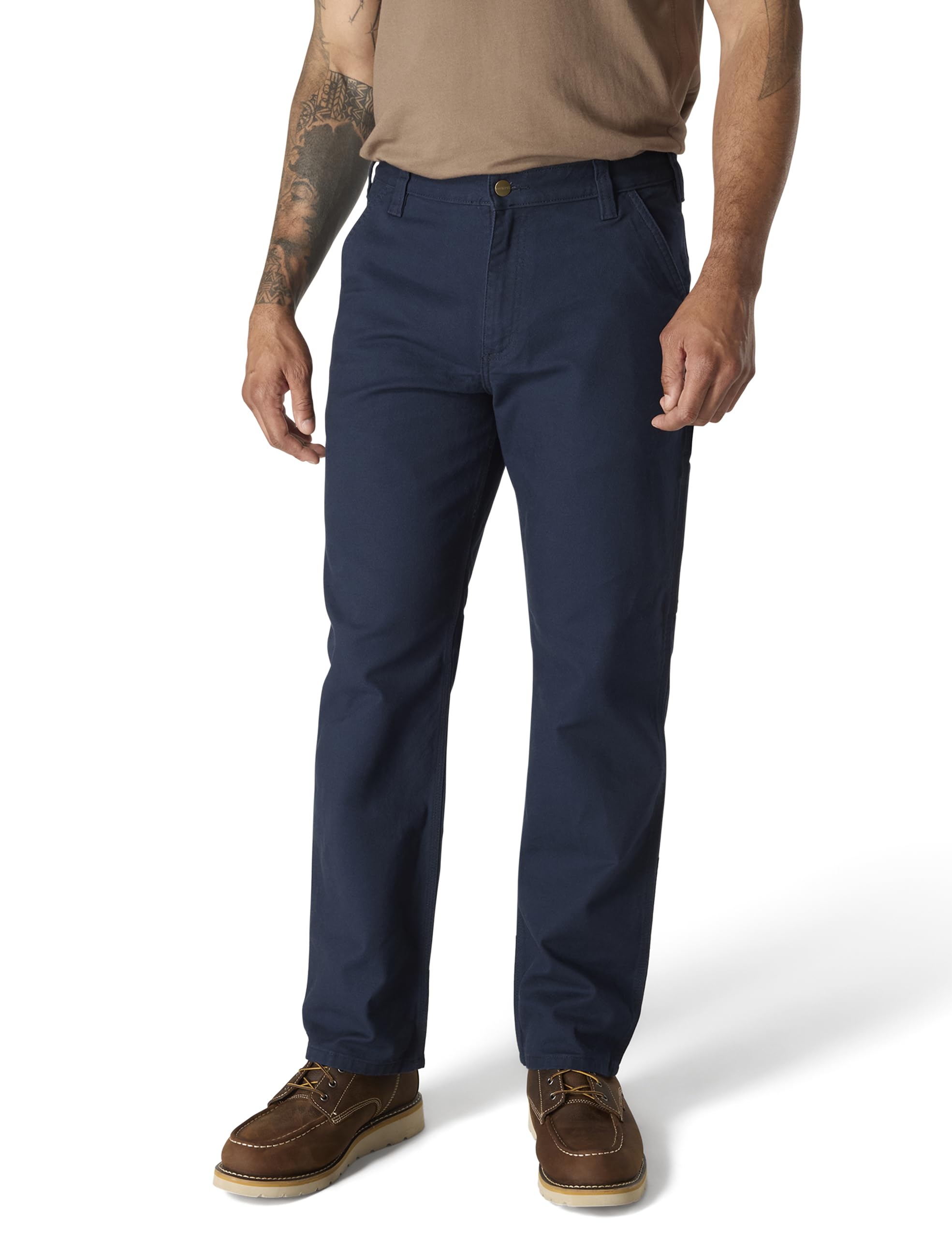 Description This dungaree features a hint of stretch for comfort and a cell phone pocket for functionality. It's made from 8-ounce, 98 percent cotton/2 percent spandex canvas and sits at the waist, has a relaxed seat and thigh, reinforced front slash pocket, belt loops sewn on the seam for strength, right-leg secured cell phone pocket and straight leg opening.