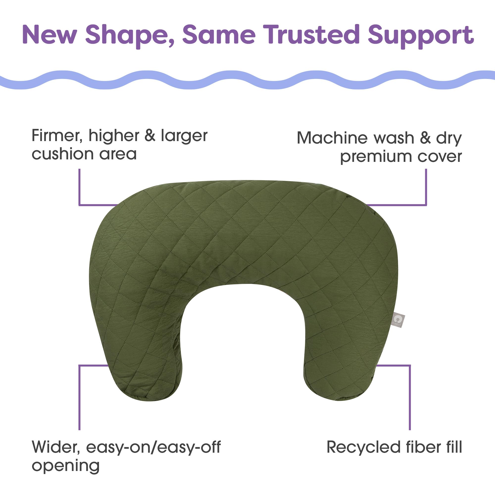 Introducing the Boppy Nursing Pillow, your comfy, snuggly sidekick for feeding moments. This redesigned cutie, dreamed up by clever moms, gives your arms and back a break while keeping baby at the perfect angle for breastfeeding and bottle feeding. Did you know the average nursing mom clocks over 35 hours a week feeding? Talk about a full-time job. But fear not, our Boppy® Nursing Pillow is here to save the day (and night), just as our Original Boppy® Nursing Pillow has done for 35 years. With its updated, versatile design, you can cradle, cross cradle, or football hold with ease. This pillow’s got your back (literally) with its larger, firmer shape that hugs every body type just right, keeping baby snug and positioned just right. It’s small enough to fit in your rocking chair or glider but big enough to deliver all the support you need. No wonder it’s been a registry must-have and a favorite among moms, dads, caregivers and lactation consultants alike for over three decades. The easy-on, easy-off, beltless design has a wider opening and means you can pop it on with one hand—because what new mom or dad has two free hands? Plus, its removable cover is machine washable for those inevitable messes. Filled with hypoallergenic, recycled fiber, it’s as carefree as it is cozy. Got a laundry day? No worries. We’ve got extra covers so you can always have a fresh one ready. Just remember, this pillow is for supervised awake-time only—no snoozing allowed! Trust Boppy to keep you and your baby comfy, happy, and oh-so-confident. Let’s make feeding time the best time.