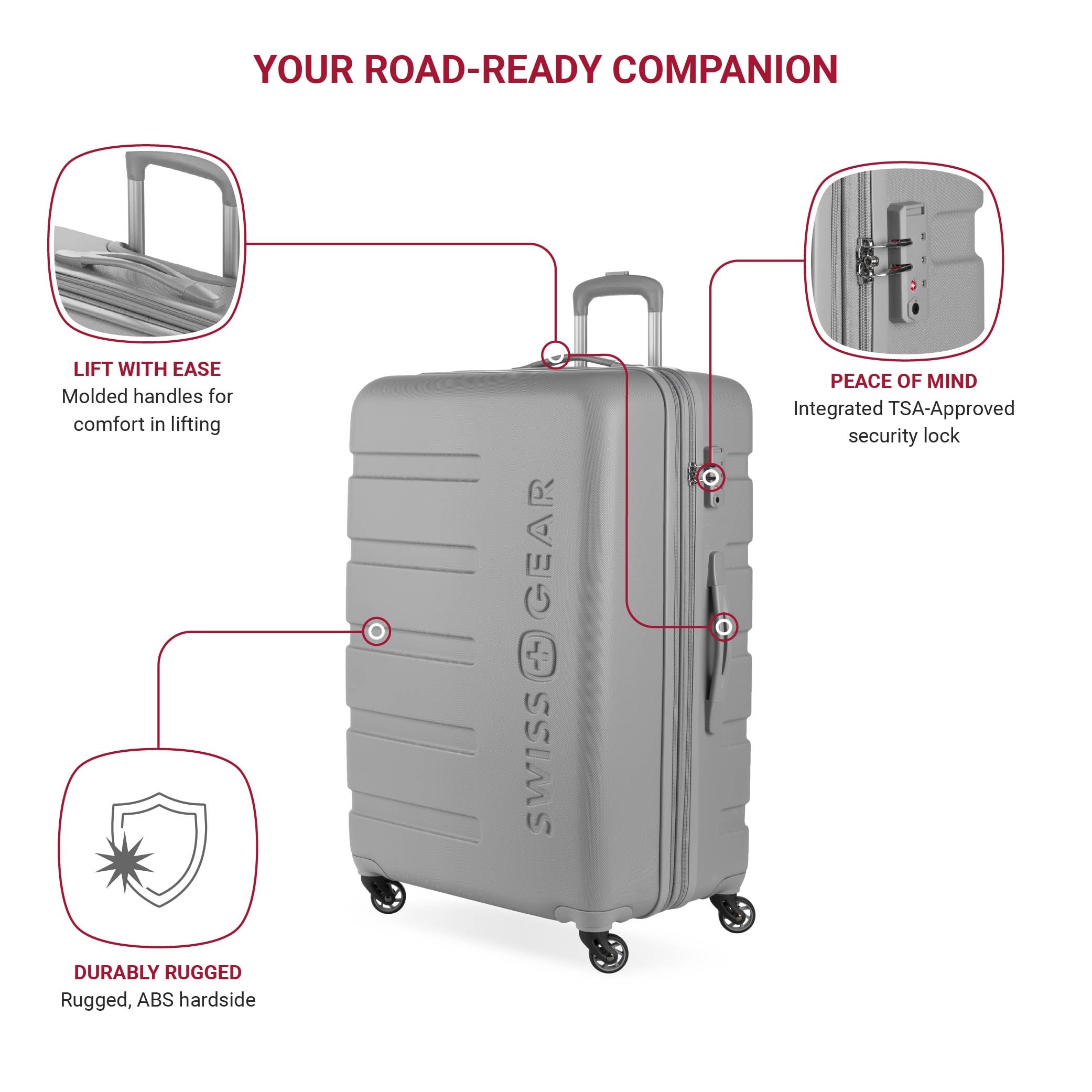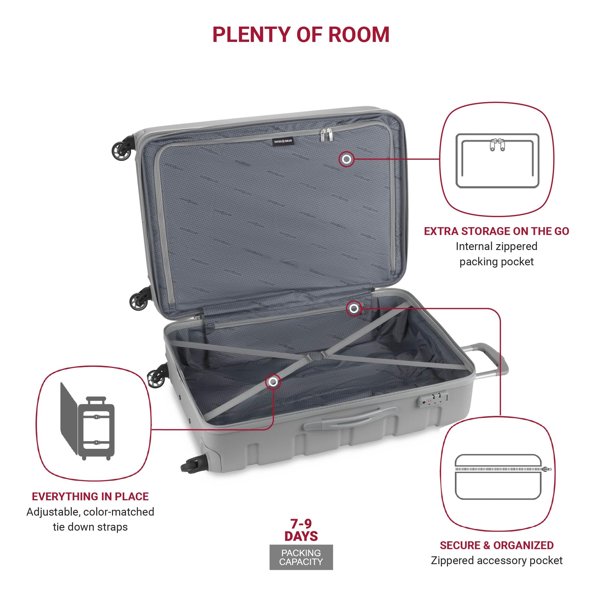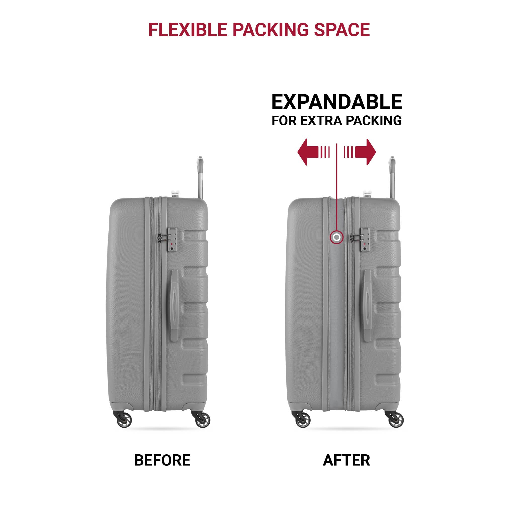 Description SwissGear 7366 Hardside Expandable Luggage with Spinner Wheels is the perfect bag for your next trip. This 27-inch suitcase is made of durable ABS/PC and includes co-molded lift handle(s) with soft rubber hand grips for easy maneuverability. The split-case design expands for additional packing space and internal pockets keep you organized. The 8 360-degree multi-directional spinner wheels and a premium, push-button steel locking telescopic handle make it easy to navigate through the airport. With outside dimensions of 30.75 x 20.5 x 12.25 inches including wheels and handles, this suitcase offers 27.25 x 19 x 12.25 inches of packing space. This hardside luggage is perfect for those who need a lightweight and durable suitcase for their travels. The hardshell exterior is designed to protect your belongings from the wear and tear of travel, while the spinner wheels make it easy to move around. The telescopic handle is designed to be comfortable and easy to use, and internal pockets help you stay organized. Plus, this suitcase comes with a 10-year warranty against defects in materials and workmanship.