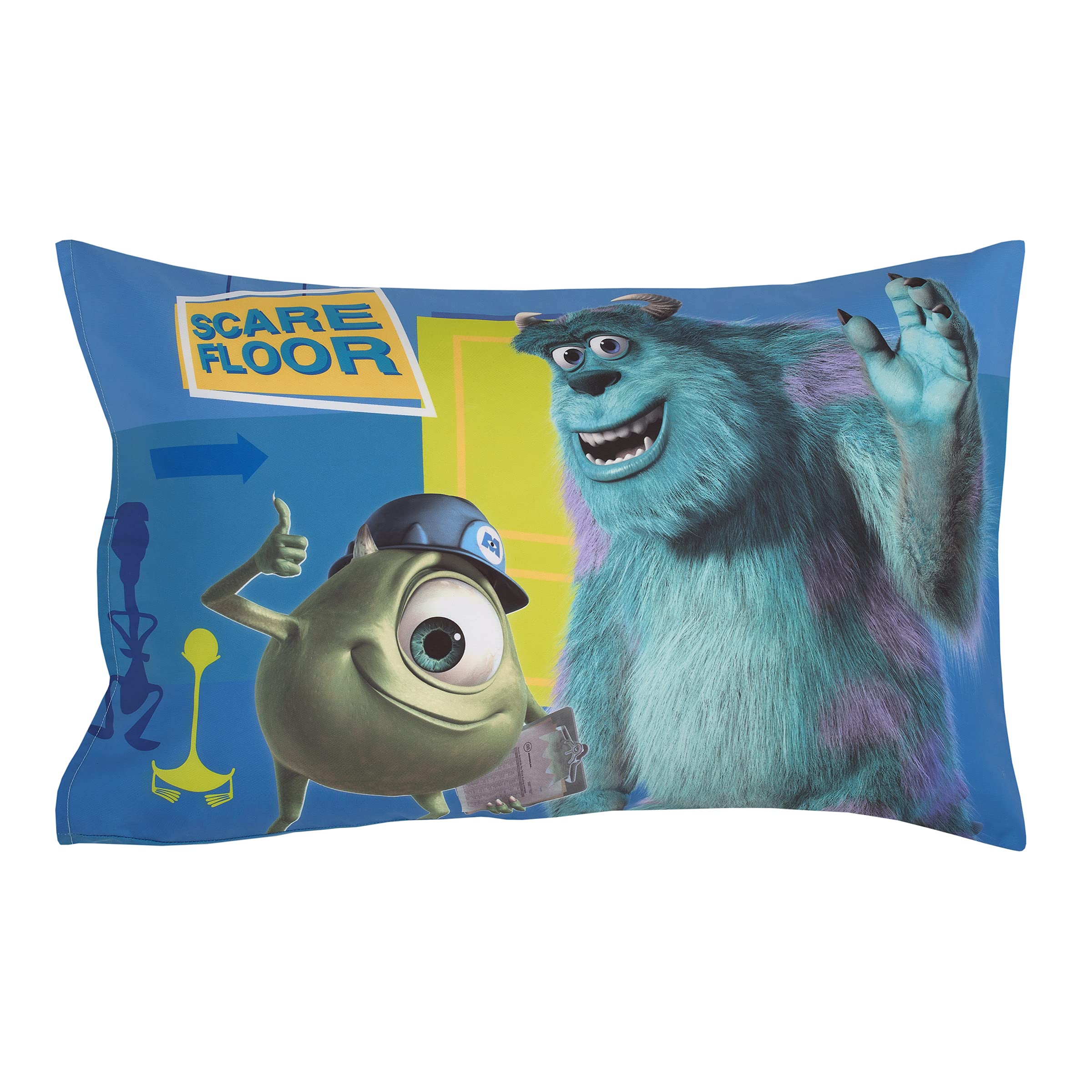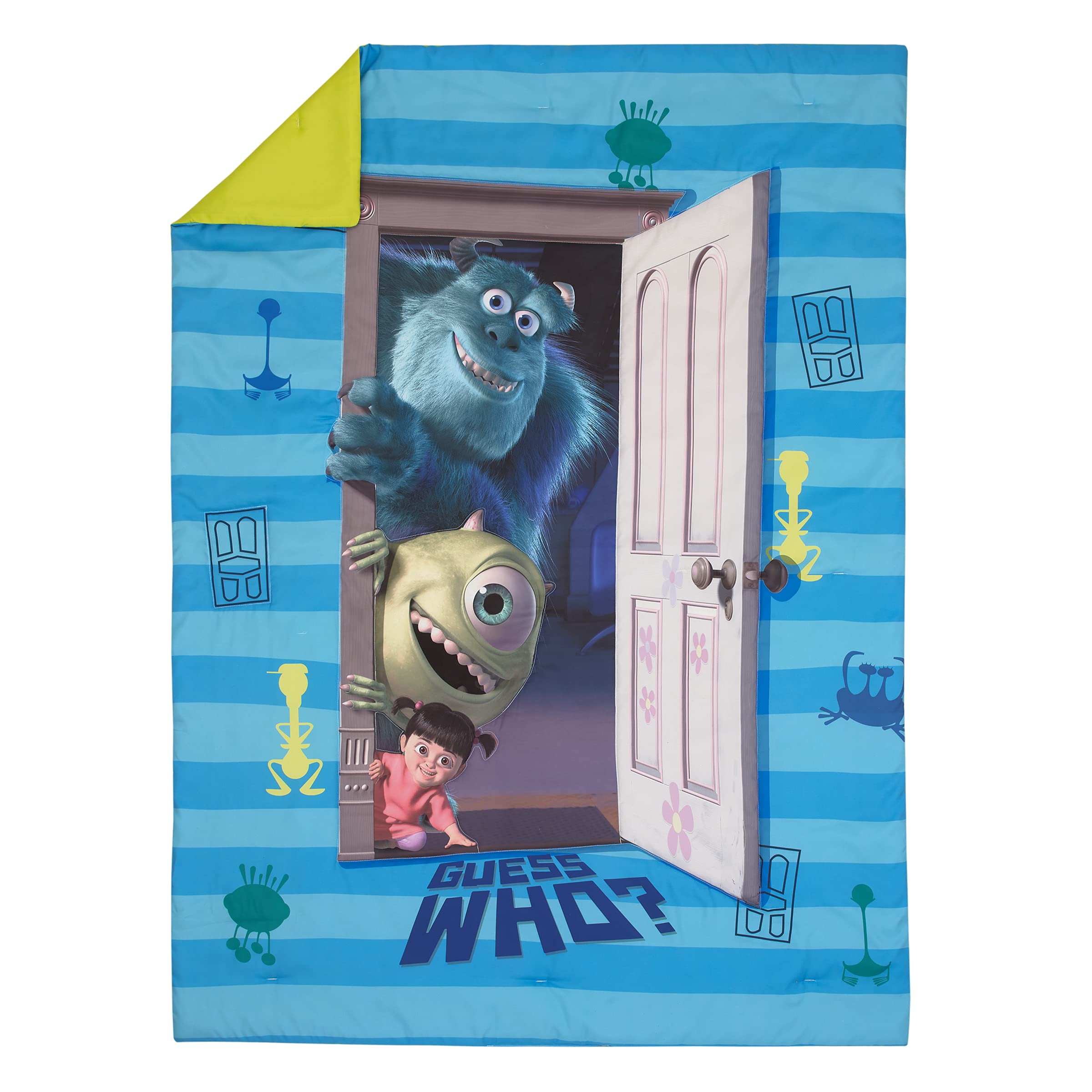 The Monsters Inc. Guess Who 4 Piece Toddler Bed Set includes everything needed for your toddler bed - a comforter, fitted sheet, flat top sheet and pillowcase, all featuring those favorite monsters Mike and Sulley in shades of blue and green. The 57" x 42" printed comforter has Sulley, Mike and Boo peeking out from the closet door on a blue striped background with the words Guess Who on the front. Reverses to a solid green back. The reversible pillowcase measures 20" x 30" and has Mike and Sulley in two different poses on the front and back. Fits a standard size pillow. The set is finished with solid green sheets - one fitted with fully encased elastic on sides for a snug fit, and one flat top sheet. Fits a toddler bed, using a standard size 28" x 52" crib/toddler mattress.