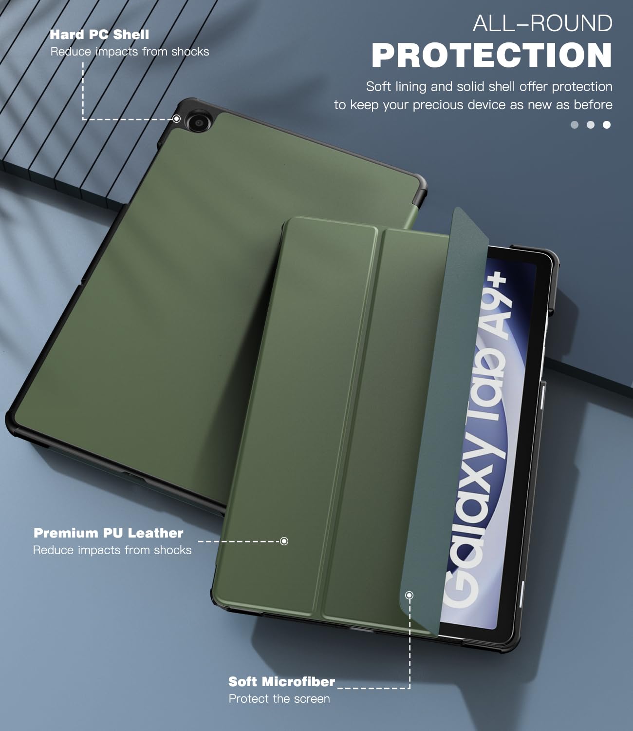 Premium Material: This Samsung A9 Plus Tablet Case is made of premium PU leather exterior, soft microfiber interior lining, and back hard PC cover design protect your tablet against the bumps and scratches of everyday life