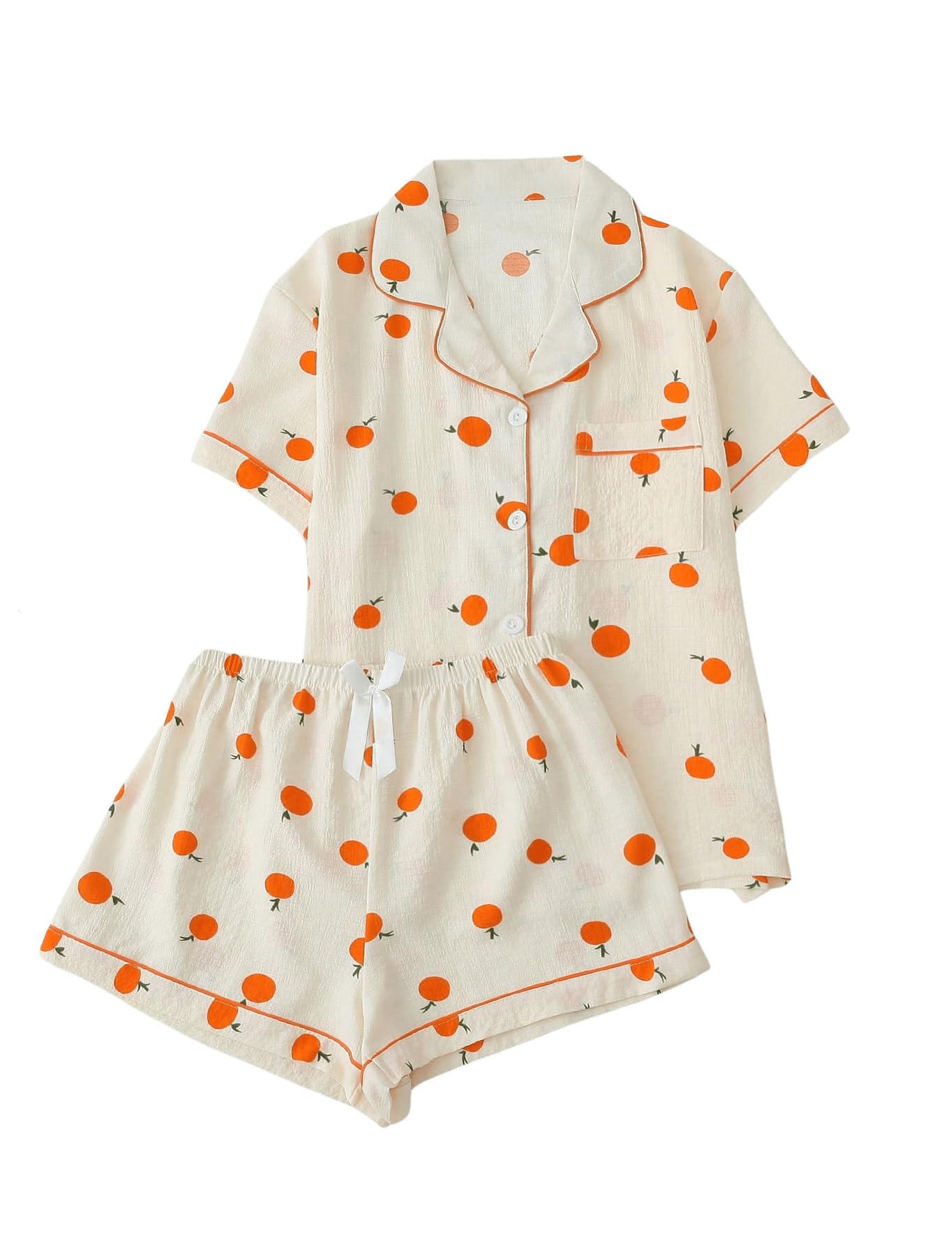 Lapel Collar, Short Sleeve, Print Pajamas, Bow Decoration, Button Down Top and Shorts, Loungewear Sets, Women's Sleepwear.