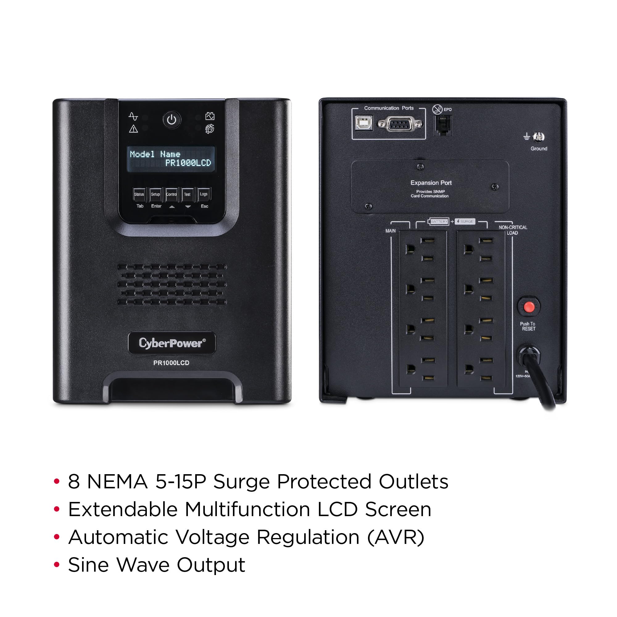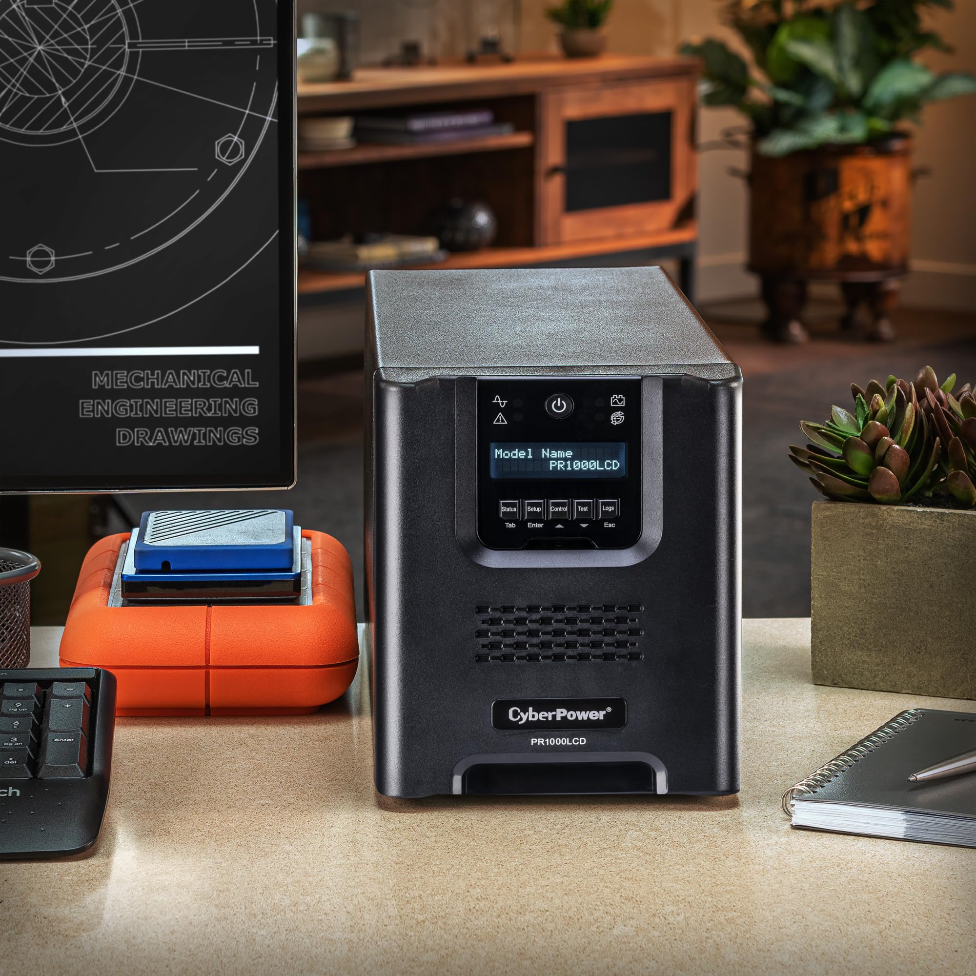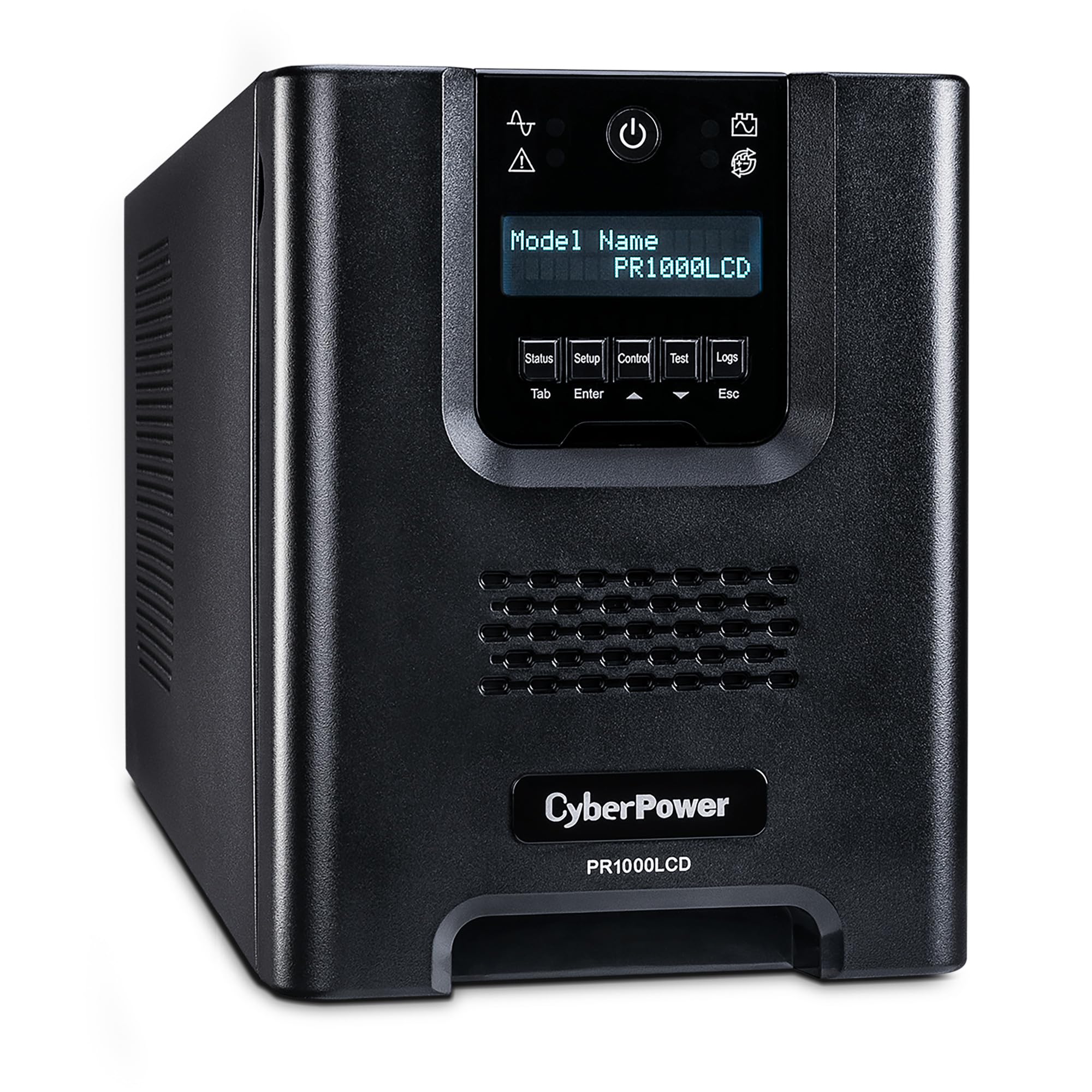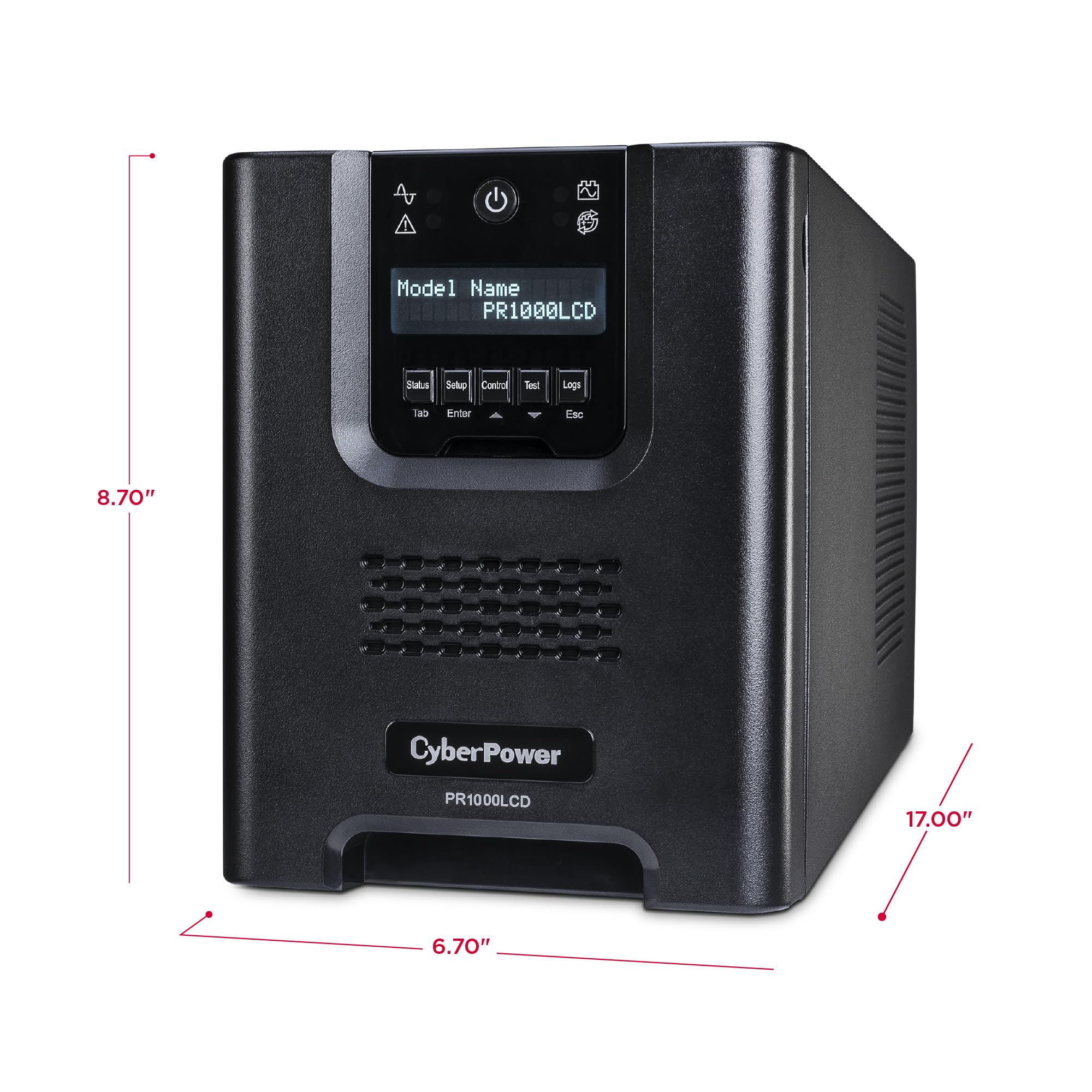 The CyberPower Smart App Sinewave PR1000LCD mini-tower uninterruptible power supply (UPS) with LCD Control Panel and pure sine wave output is Active PFC compatible for safeguarding mission-critical servers, telecom equipment, VoIP and internetworking hardware that require seamless pure sine wave power. Its full Automatic Voltage Regulation (AVR) boost/buck topology delivers a consistent and clean AC power, protecting connected equipment and preventing costly business interruptions. Patented GreenPower UPS advanced circuitry reduces UPS energy costs by up to 75% compared to competitive models. The LCD Control Panel provides 41 different settings to check status and customize the operating settings for the PR1000LCD, plus it can be removed and mounted separately from the UPS for ease of use regardless of where the UPS is installed. Functions include menus for checking power status on (11) different parameters, (23) settings for setup and control of the UPS, (3) battery test & calibration options, and (4) selections in the Log menu. With its attached cable the LCD Control Panel can be removed from the UPS and relocated up to 4.5 FT away from the UPS for ease of viewing when installed in hard to reach locations. The PR1000LCD unit has a capacity of 1000VA/1000Watts, six (8) NEMA 5-15R receptacles and two (2) maintenance-free, user-replaceable 12V/12Ah batteries. This unit offers connectivity via one (1) HID USB, one (1) DB9 serial and one (1) emergency power off (EPO) port. EMI/RFI filters increase the immunity of the load to noise disturbances.