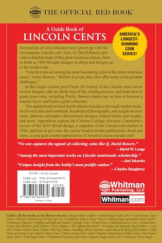 đ Definitive Reference â The updated 4th edition by Q. David Bowers traces the Lincoln centâs history from 1909 to today, covering every design change, alloy adjustment, and minting evolution. đ° Values & Market Trends â Includes retail pricing for every date and mintmark, plus expert analysis of collecting and investing opportunities. đ Grading & Varieties â Learn to grade circulation and Proof coins, identify errors, spot die varieties, and understand Proof designations. đźď¸ Rich Illustrations â Features hundreds of detailed, full-color photographs that showcase the beauty and history of Americaâs most collected coin. â Essential for Collectors & Investors â Whether youâre new to collecting or a seasoned expert, this trusted Red Book Series⢠guide provides the knowledge, strategies, and pricing data you need to build and grow a rewarding collection of Lincoln cents. Generations of collectors have treasured the Lincoln cent, Americaâs most iconic coin. In the updated fourth edition of Whitmanâs Guide Book of Lincoln Cents, celebrated numismatist Q. David Bowers presents the definitive reference on this enduring classic, tracing its story from the 1909 debut to the present day. This richly illustrated volume explores every design change, alloy adjustment, and minting evolution across more than a century of production. Readers will discover in-depth coverage of the seven reverse designs, insights into the minting process, and practical guidance on grading both circulation and Proof strikes. Collectors will find strategies for building their collections, tips for spotting errors and patterns, and a fascinating look at alternative designs, including Bicentennial proposals, tokens, and medals. Inside you'll find: Market values and analysis for every date and mintmark Hundreds of high-quality photographs Appendices on error coins, die varieties, and steps for gaining recognition of new varieties in hobby publications Historical insights, such as the Citizens Coinage Advisory Committeeâs review of the 2010 Shield reverse A snapshot of the Lincoln cent market in 1946 And much more! Immerse yourself in the fascinating world of pennies with this updated fourth edition of Guide Book of Lincoln Cents, part of Whitmanâs renowned Red Book Seriesâ˘. This acclaimed series spans nearly 30 volumes, each offering in-depth coverage of specific U.S. coin types and programs featured in the Official Red Book.