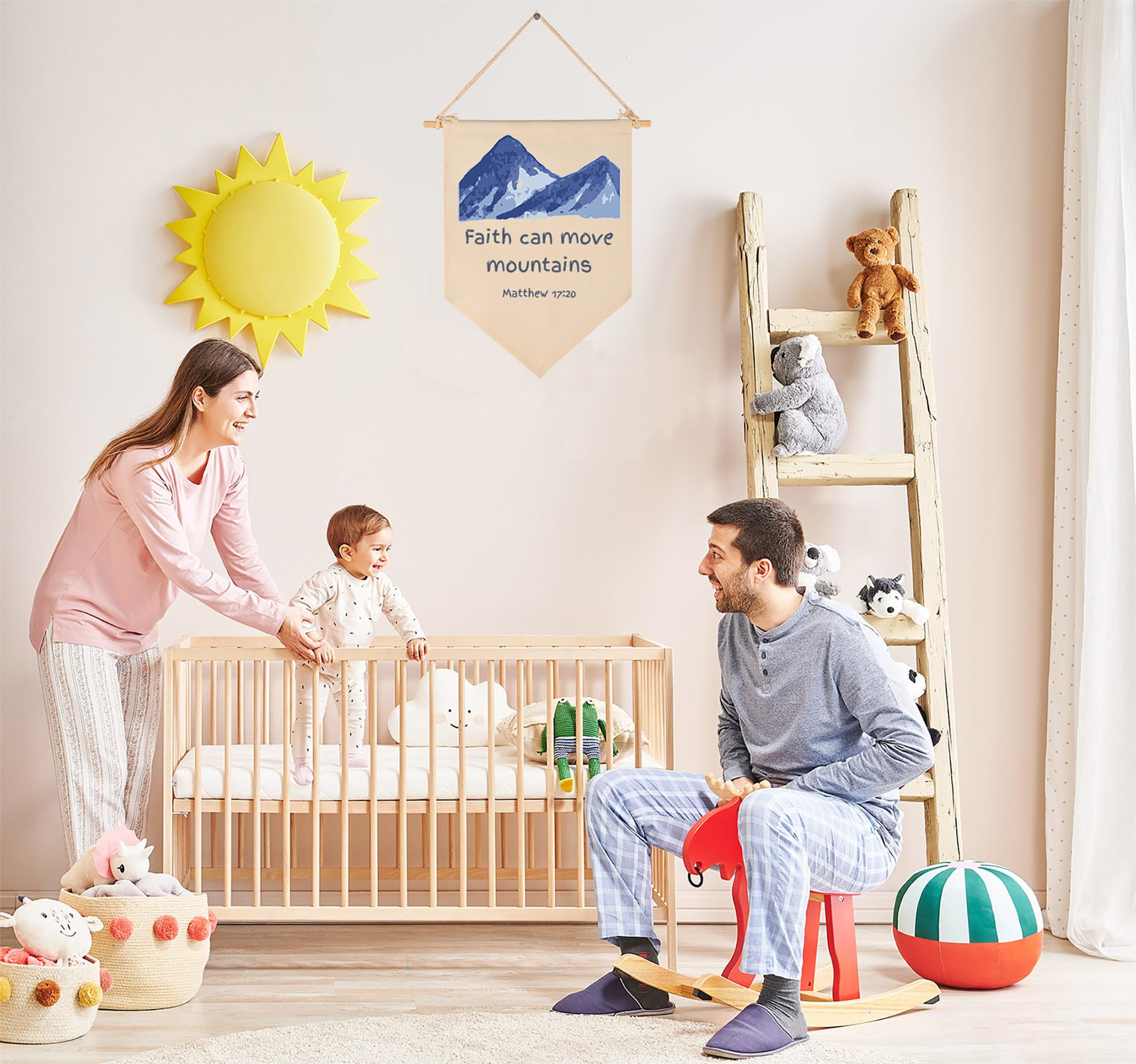 Crafted from natural cotton canvas, this 15.4 x 11 inch nursery wall banner brings a soft and calming touch to baby room, above crib or toddler space. The durable fabric keeps its shape with a natural texture, while the clear print stays bright with everyday use. Lightweight and easy to hang, it comes with a wooden dowel and pre-tied twine for quick setup on walls, doors or shelves. The versatile size fits small spaces without feeling crowded, making it perfect for creating a cozy nursery atmosphere. A thoughtful gift for baby showers, newborn arrival or first birthday.