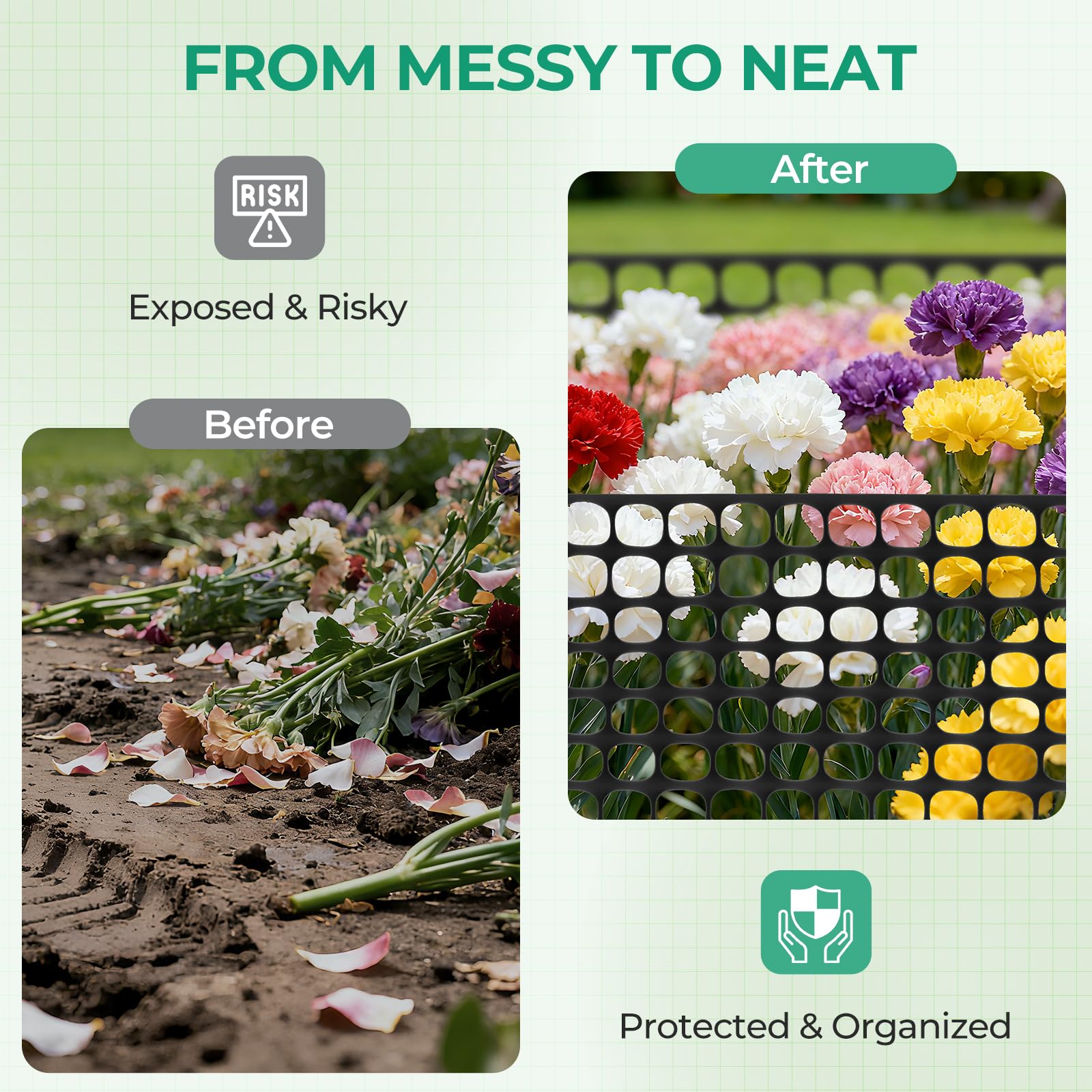 Enliven Your Garden: Ohuhu 4×100ft/10.7LB plastic garden fence acts as an effective garden fence animal barrier that defends your carefully tended landscape. The 1.7×1.7in mesh allows ample airflow and sunlight for healthy plant growth, while keeping out unwanted animals and passersby to safeguard your flowers, vegetables and outdoor space