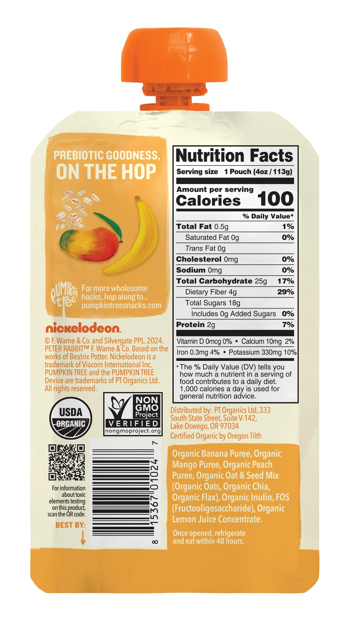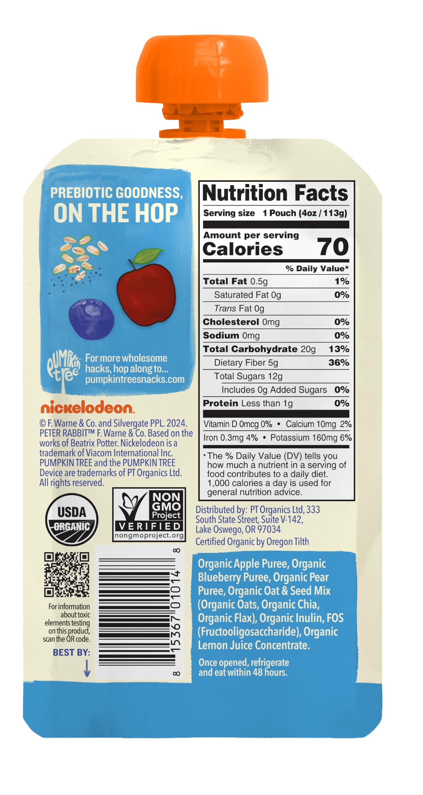 Peter Rabbit Organic Fruit, Oats & Seeds Puree, Variety Pack, Good Source of Dietary Fiber, USDA Certified Organic, Non-GMO, Apple & Blueberry (6), Banana & Mango (6), & Banana & Strawberry Baby Puree (6), 4 Ounce (Pack of 18) - 6 of each. Peter Rabbit Organics Prebiotic Oats & Seeds, Squeezable Pouches, 4 Ounce (Pack of 18): Keep your little one from getting 'hangry’ with Pumpkin Tree's Peter Rabbit Organics pouches with Prebiotic Fiber. Our simple and tasty plant-based pouches are Clean Label Project Approved and made with USDA Organic Certified and Non-GMO Project Verified ingredients, offering an Excellent Source of Fiber and come in handy BPA-Free pouches. Whether it’s the morning rush, or after school club, our squeezy pouches are the ideal size to carry in your bag for snack time. Pumpkin Tree Peter Rabbit Organics Naturally wholesome snacks for kids & toddlers: Clean Label Project Approved and made with USDA Certified Organic and Non-GMO Project Verified ingredients, are not diluted with water and come in handy BPA-Free pouches Instructions: Enjoy straight from the pouch; Once opened refrigerate and consume within 48 hours. Perfect for toddlers but suitable for everyone from 6 months old Clean Label Project Approved, USDA Certified Organic and Non-GMO Project Verified ingredients and Excellent Source of Fiber, including Prebiotic Fiber. Perfect for toddlers but suitable for everyone from 6 months old: BPA-free squeezable pouches ideal size for bags or lunchboxes. Toddler Snack 18 Pouches in each Variety Pack: Flavors include 6 Apple Blueberry, 6 Banana Mango, and 6 Banana Strawberry