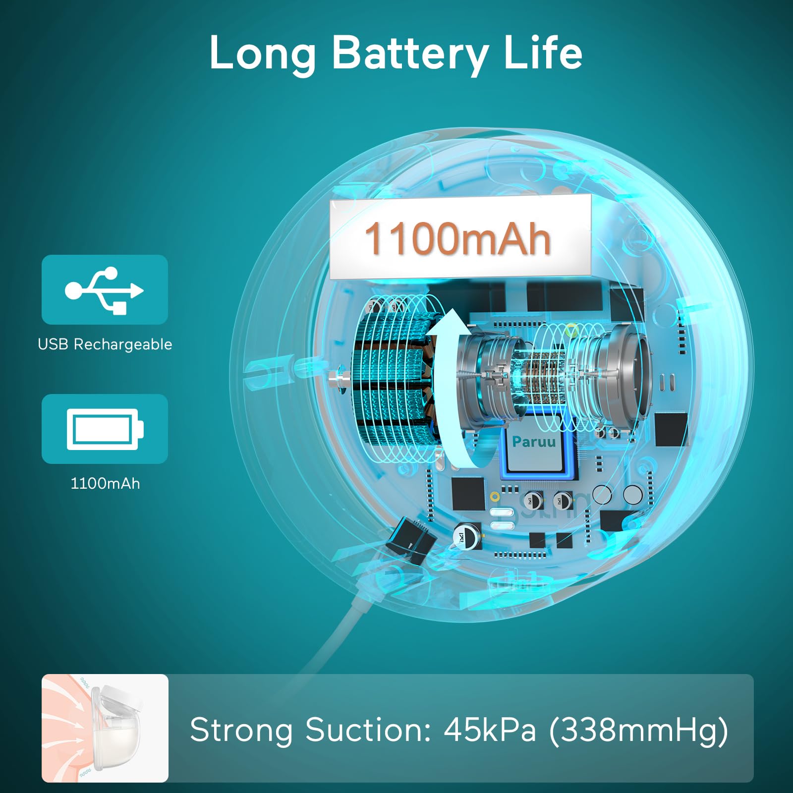 One Charge for One Day: The hands-free breast pump can be fully charged in 2 hours for 120 minutes (4-5 sessions) usage. 1100mAh battery. USB charging.