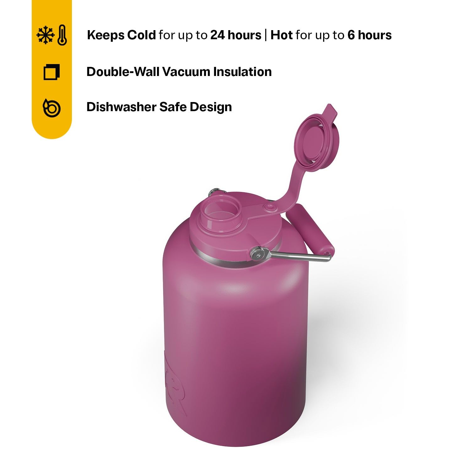DOUBLE-WALL INSULATION: Double-wall vacuum insulation provides the best temperature retention; this insulated water jug keeps drinks cold for up to 24 hours and hot beverages warm for up to 6 hours; ideal for long hikes, workdays, or road trips