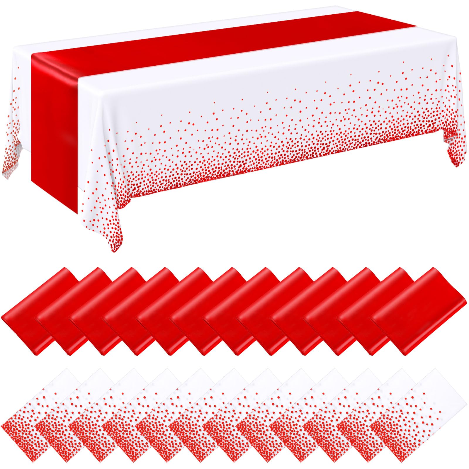 Features: Pleasant using experience: The set of rectangle table cloth is suitable for wedding banquet decoration and any other indoor or outdoor occasions. In other words, it could play a decorative role while protecting your table from stains, bringing yourself and guests a pleasant experience. Preparation before use: Due to long distance transportation, these centerpieces for party tables may be a little crumpled, which is the normal phenomenon. You can use an iron to smooth and flatten these clothes before using them. Specifications: Material: satin and plastic Main color: white red Size of table cloth: approx. 54 x 108 inches Size of table runner: approx. 12 x 108 inches Package includes: 12 x Plastic table cloths 12 x Satin table runners Notes: Manual measurement, please allow slight errors on size. The color may exist a slight difference due to different screen displays.