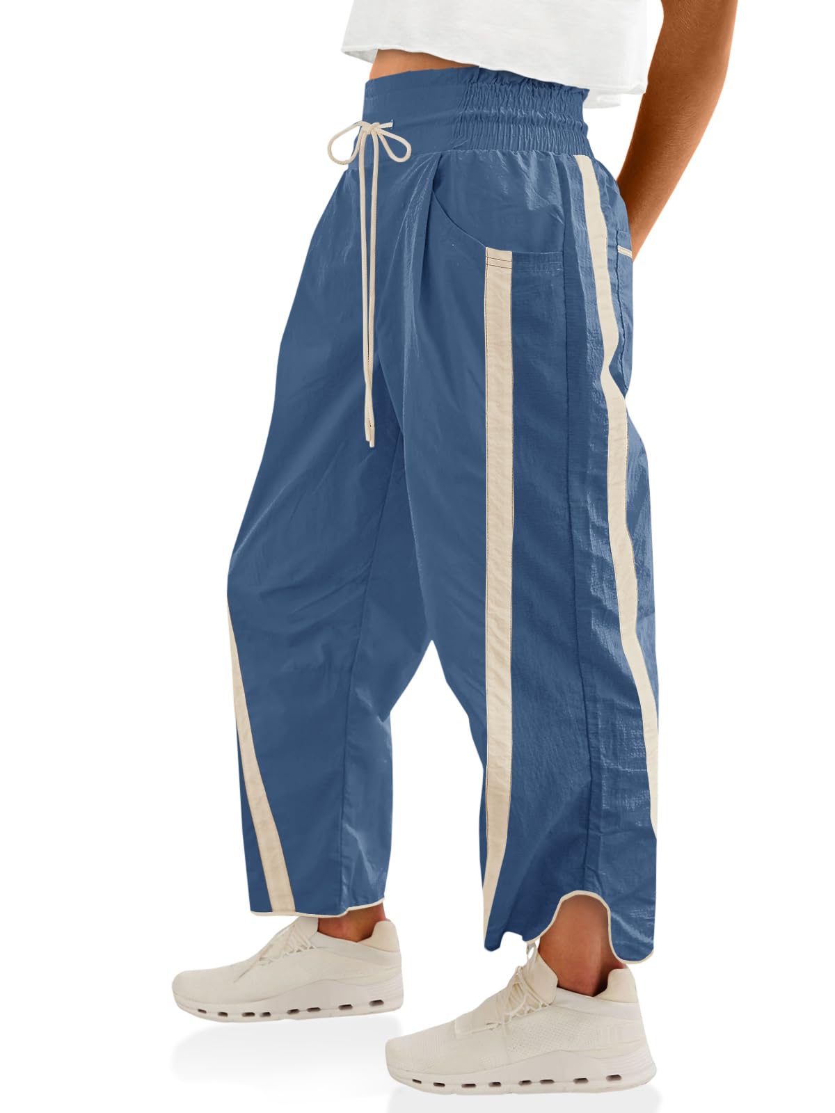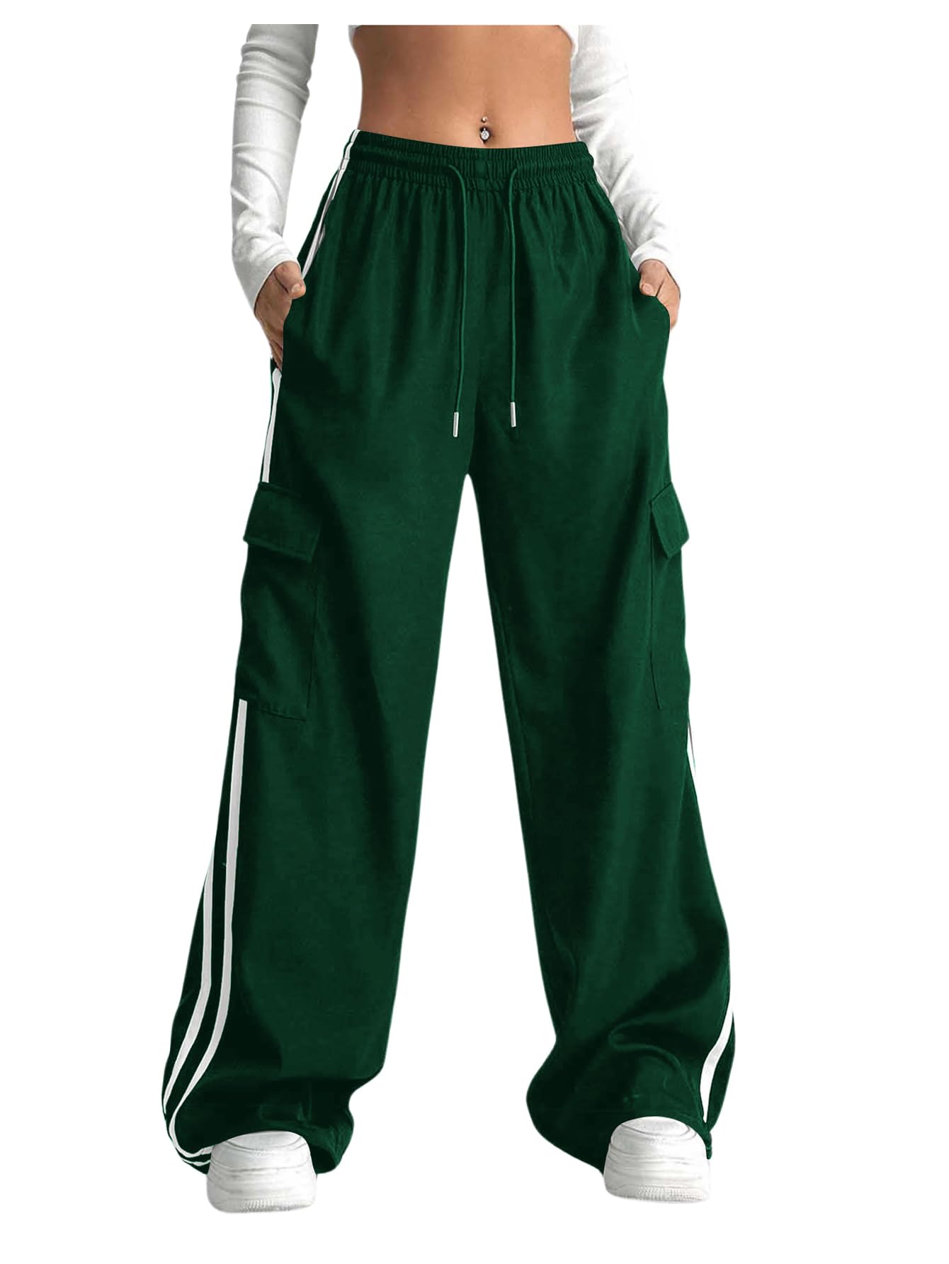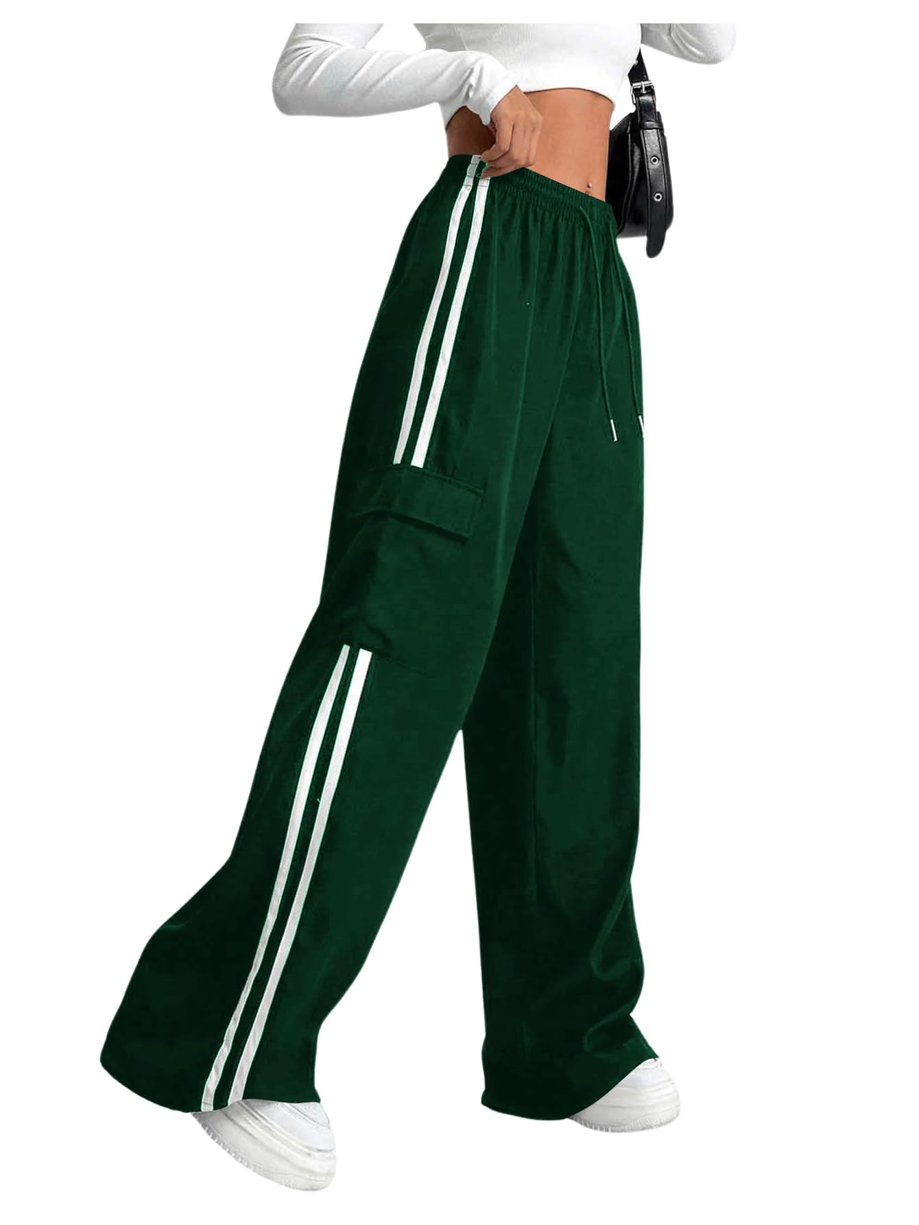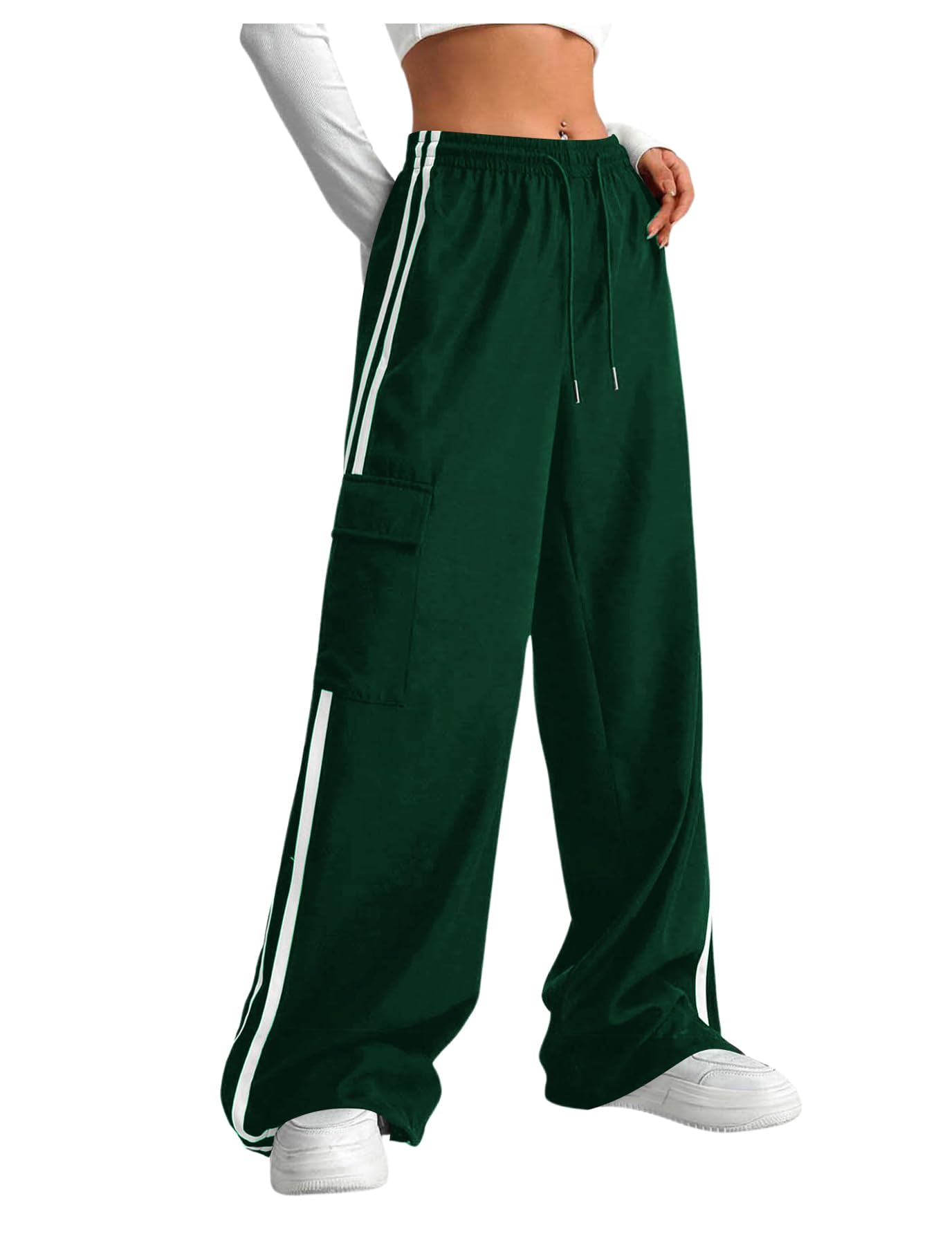 Drawstring Front and Hem, Elastic High Waist, Cargo Pocket Side, Straight Leg, Patched Stripes, Casual Long Pants