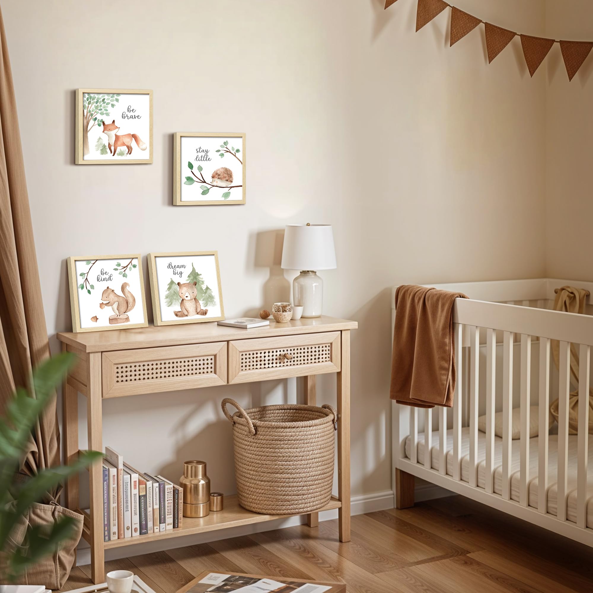 Charming woodland animals: Featuring a adorable fox, hedgehog, squirrel, and bear, these neutral watercolor illustrations bring a touch of the forest into any nursery, creating a serene and enchanting environment