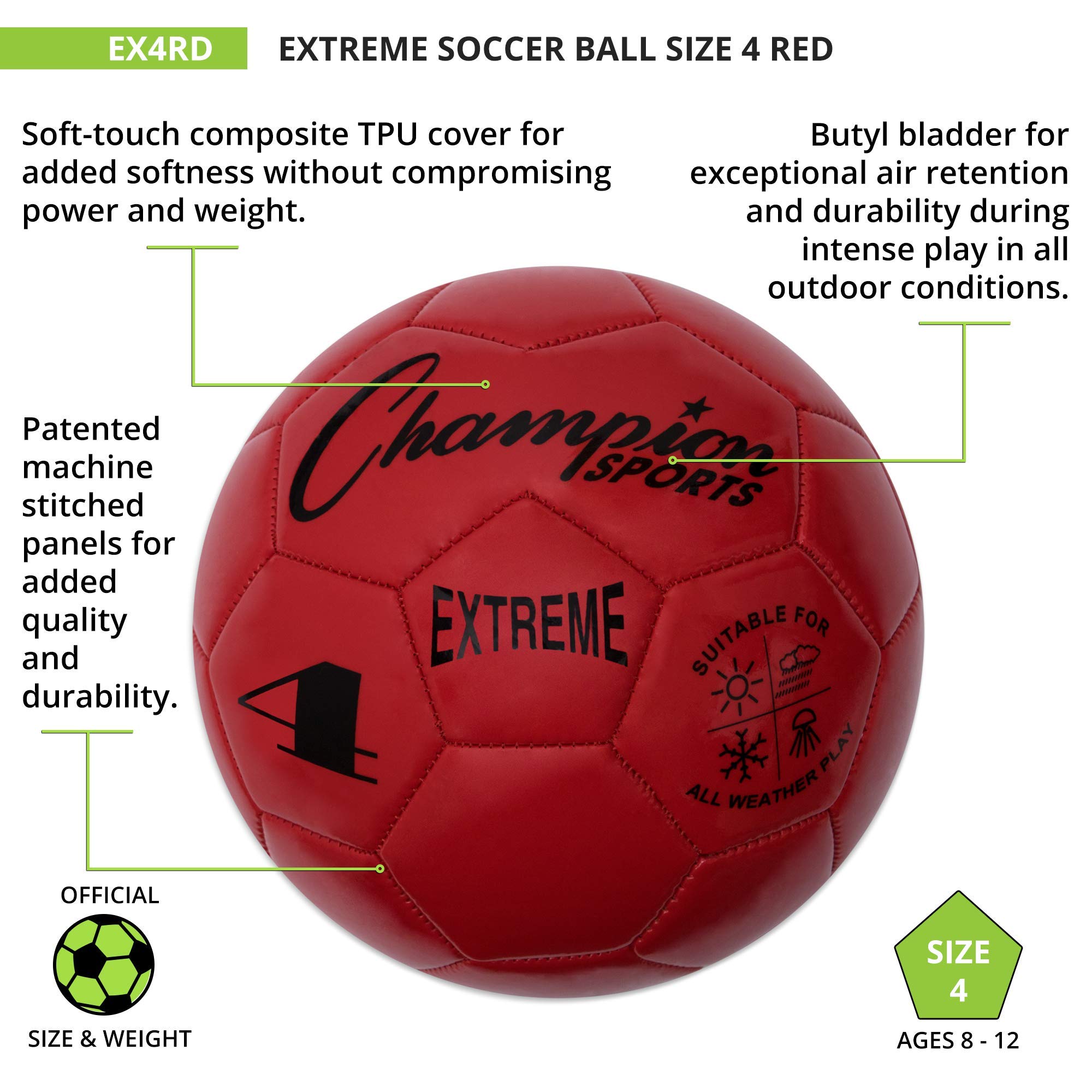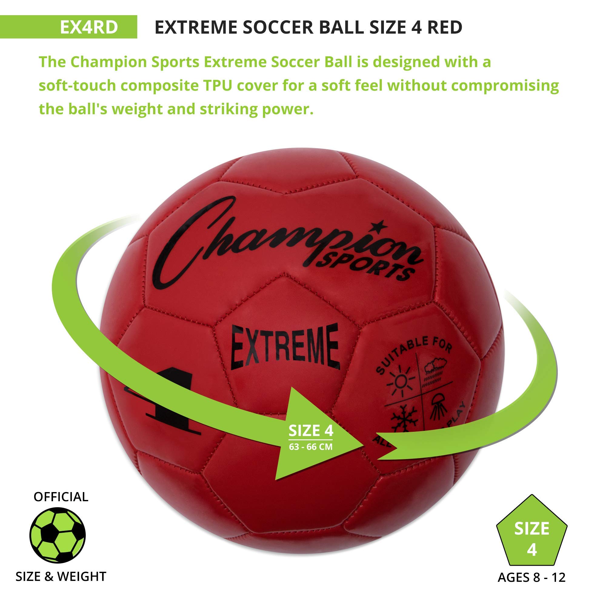 The Champion Sports Extreme Soccer Ball is a Durable, All-Weather Ball for Competition & Training. Built for both competitive matches and casual play, the Champion Sports Extreme Soccer Ball is designed to perform in any weather. Its soft-touch TPU cover provides a comfortable feel for dribbling, passing, and striking, while maintaining the weight and power needed for accurate shots. Engineered for durability, this high-quality soccer ball features a butyl bladder for superior air retention and machine-stitched panels for long-lasting performance. Whether you're playing in the heat, cold, wind, or rain, this ball maintains its shape and reliability. Available in three sizes: EX3 (Size 3): Ages 8 & under, EX4 (Size 4): Ages 8 to 12, and EX5 (Size 5 – Official Size): Ages 12 & up. Choose from a variety of vibrant colors, including Red, Orange, Yellow, Green, Blue, Purple, Black, Silver, and Pink. Note: Ball ships deflated. Pump sold separately.