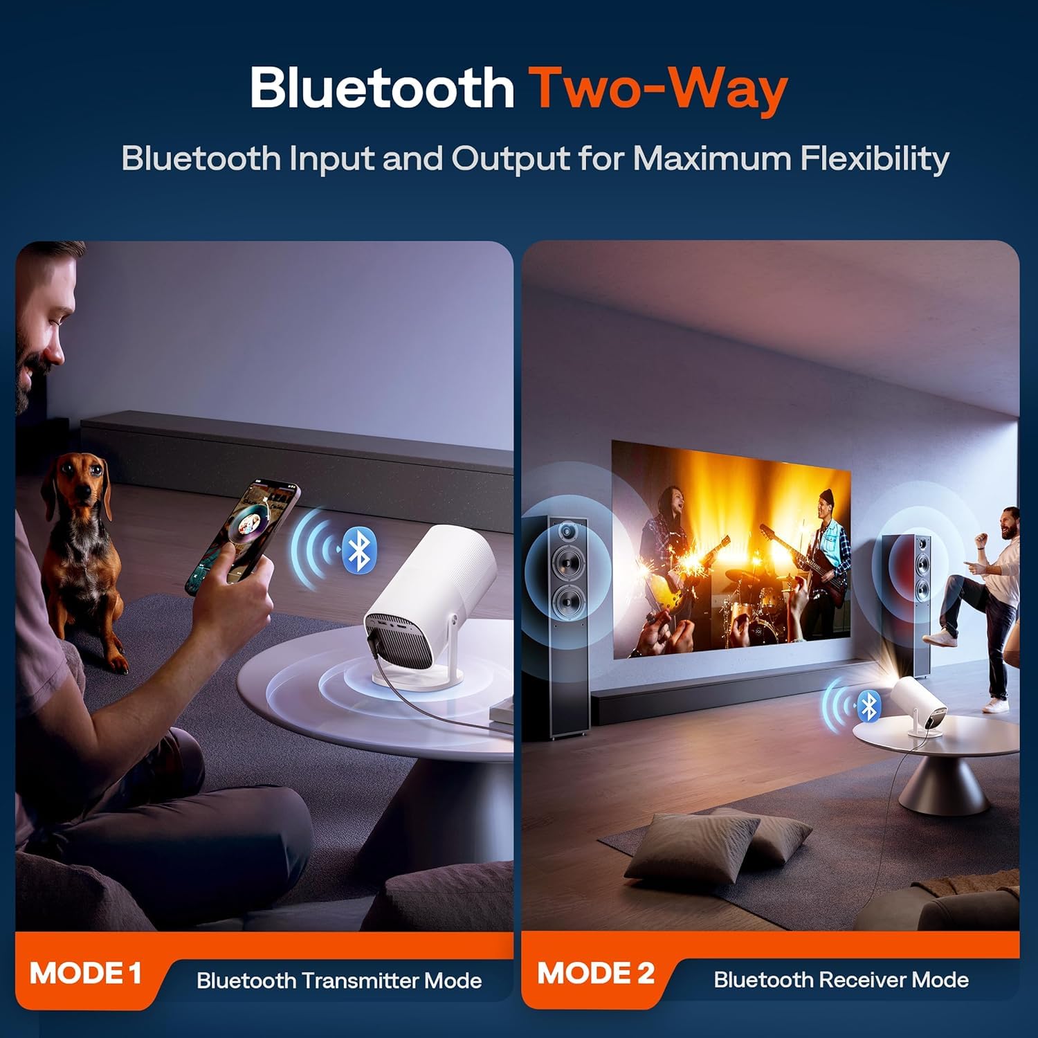 [WiFi 6 & Two-way Bluetooth 5.2 | Fast, Flexible, and Wireless Freedom] This movie projector features lightning-fast WiFi 6 with speeds up to 9.6 Gbps—nearly triple that of WiFi 5. It supports Apple devices, Miracast, DLNA, AirPlay, TV sticks, Roku, laptops, iPhones, Android devices, iPads, USB drives, and Switch/PS5, boosting gaming and wireless projection. Its Bluetooth 5.2 supports two-way audio transmission, allowing you to use the bluetooth projector as a standalone stereo speaker or connect to external Bluetooth speakers, headphones, or soundbars to enhance your home audio experience anytime, anywhere. Please note: Bluetooth supports audio transmission only, not video.