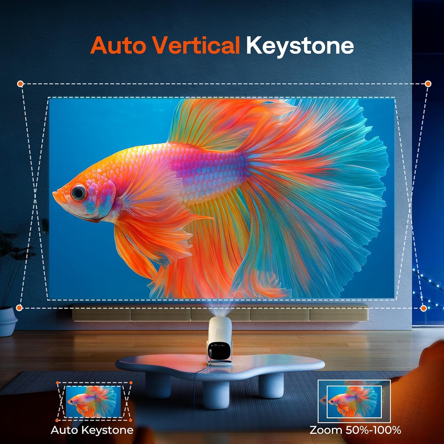 [AI Fully Automatic | 2s TOF Auto Focus & Keystone, 5× Faster and Smarter] Powered by advanced TOF (Time-of-Flight) technology, the mini projector automatically focuses in just 2 seconds, keeping images crystal-clear at all times. That’s 4× faster than traditional outdoor projectors that take up to 10 seconds to adjust. With Auto Vertical Keystone Correction, it automatically straightens the picture—no matter where you place it—delivering a perfectly aligned, rectangular image instantly. Enjoy effortless setup, instant clarity, and smooth, interruption-free viewing without any manual adjustments.