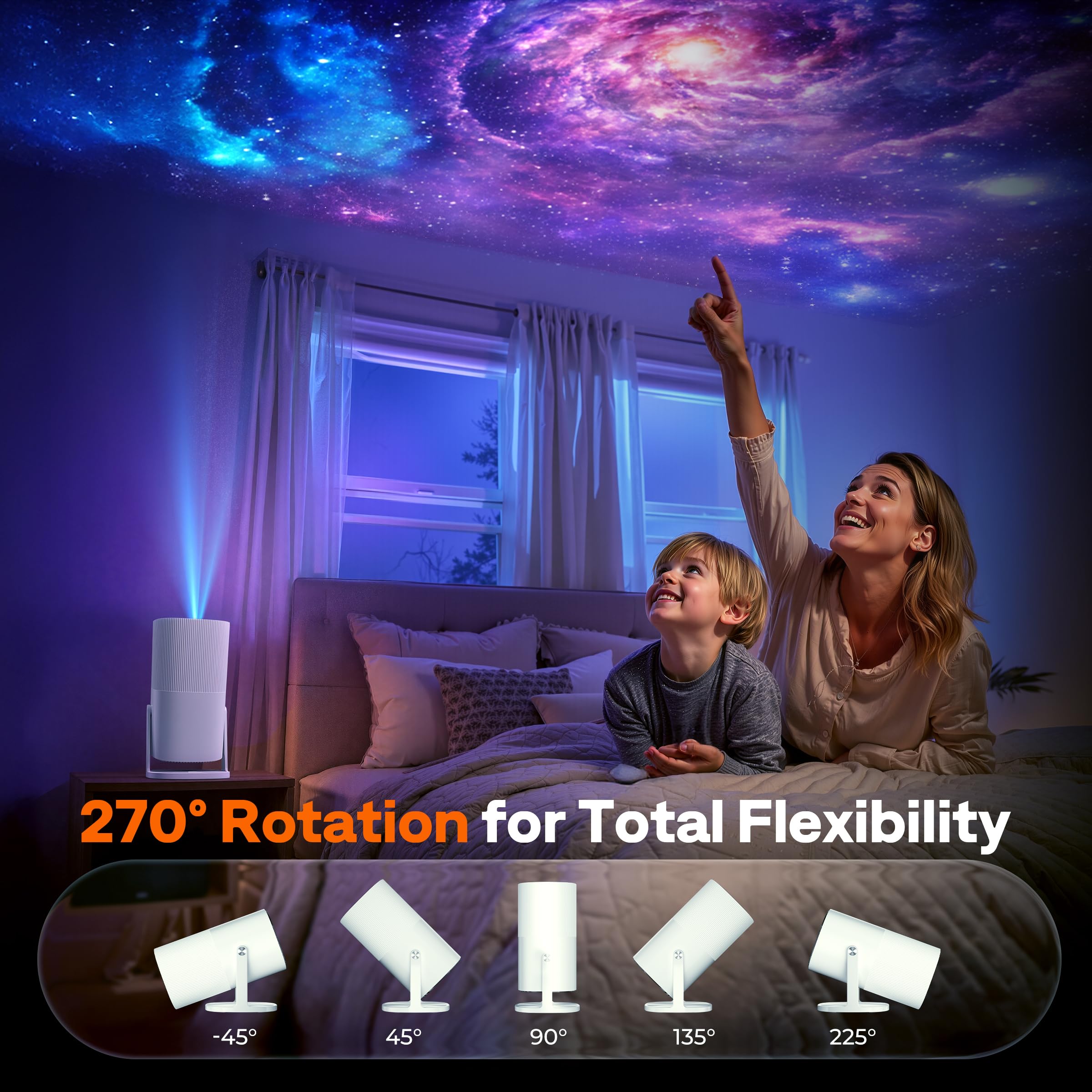 [270° Rotatable Metal Stand | Project Anywhere with Ease] Unlike most portable projectors that use plastic shafts limited to 180° rotation, our smart projector is built with a precision-engineered metal hinge that supports a full 270° range. It adjusts freely from -45° to 225°, allowing smooth ceiling projection and multi-directional positioning. The reinforced structure ensures long-lasting stability and smooth operation, while its versatile design blends effortlessly into any environment—be it the living room, office, or garden—for an elevated viewing experience from any angle.