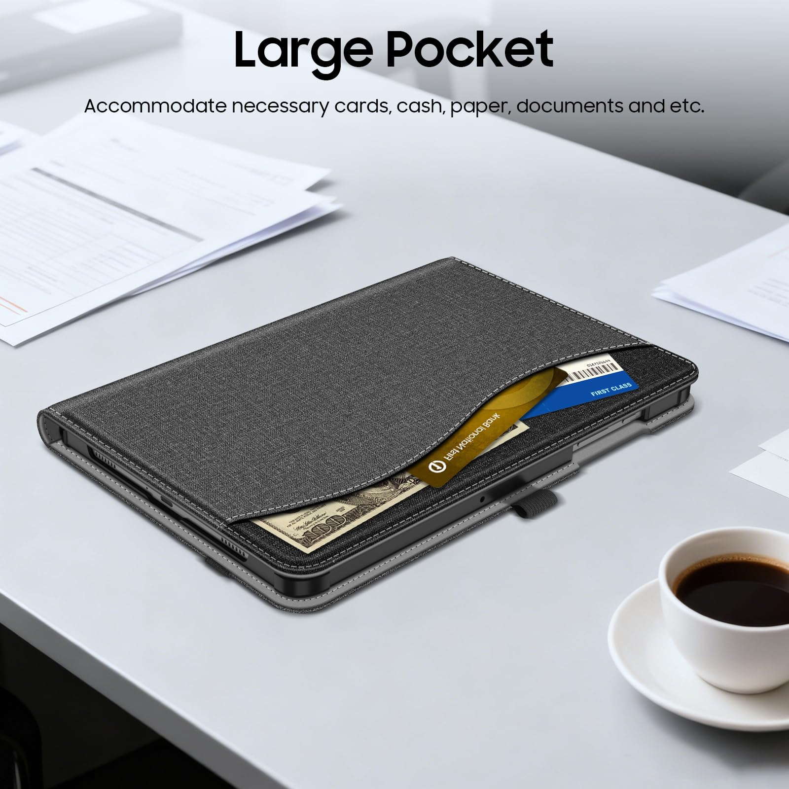 Front Pocket: A front Document Pocket to store your business cards, bank cards, notes, bills or other personal belongs while on the go